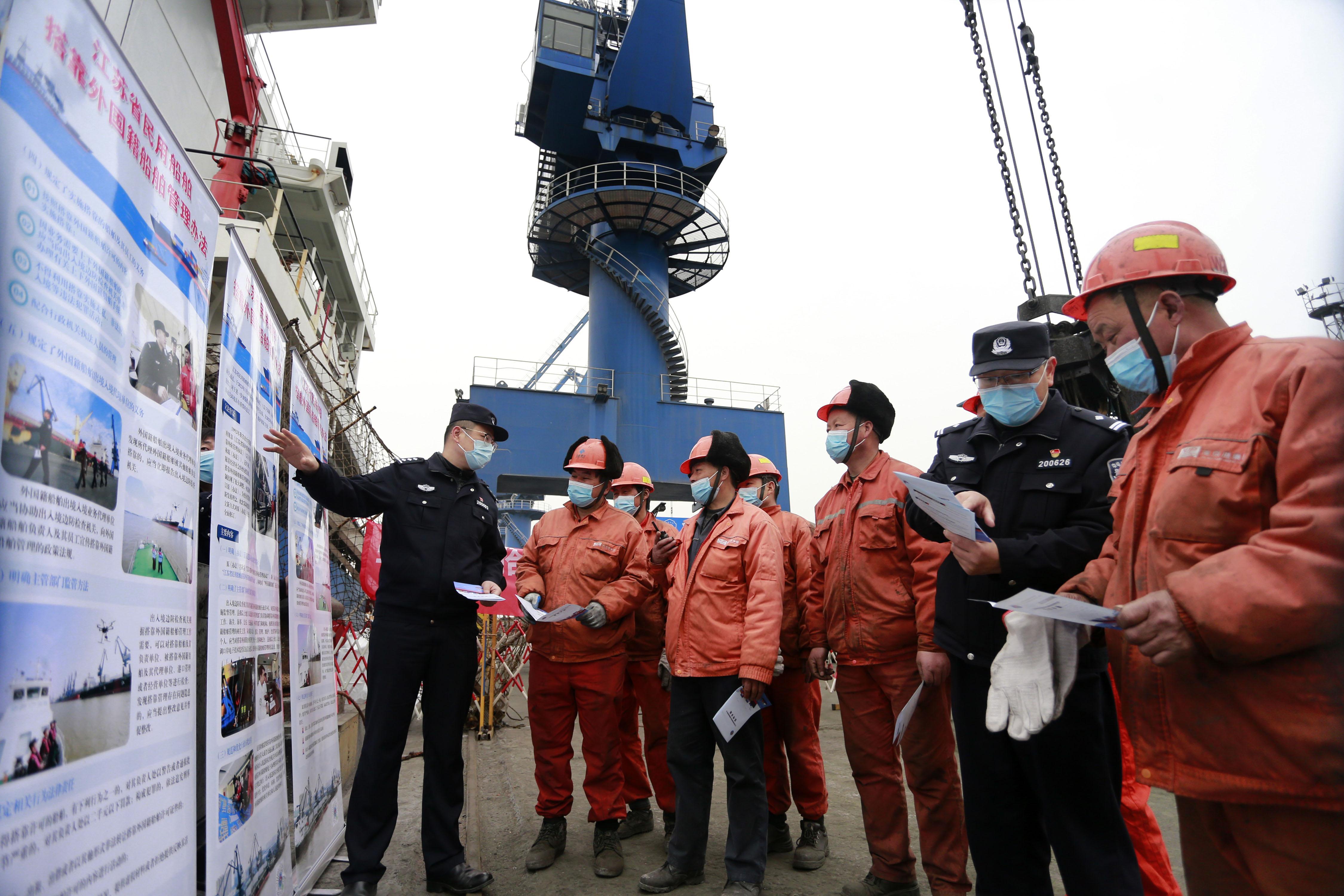 《江蘇省民用船舶搭靠外國(guó)籍船舶管理辦法》將于4月1日起施行。2月23日,江蘇南京港出入境邊防檢查站組織普法小分隊(duì)深入港口船企和碼頭,開展普法宣傳活動(dòng)。圖為普法小分隊(duì)成員向碼頭工人普及新規(guī)。 本報(bào)通訊員 張光偉 章善玉 攝
