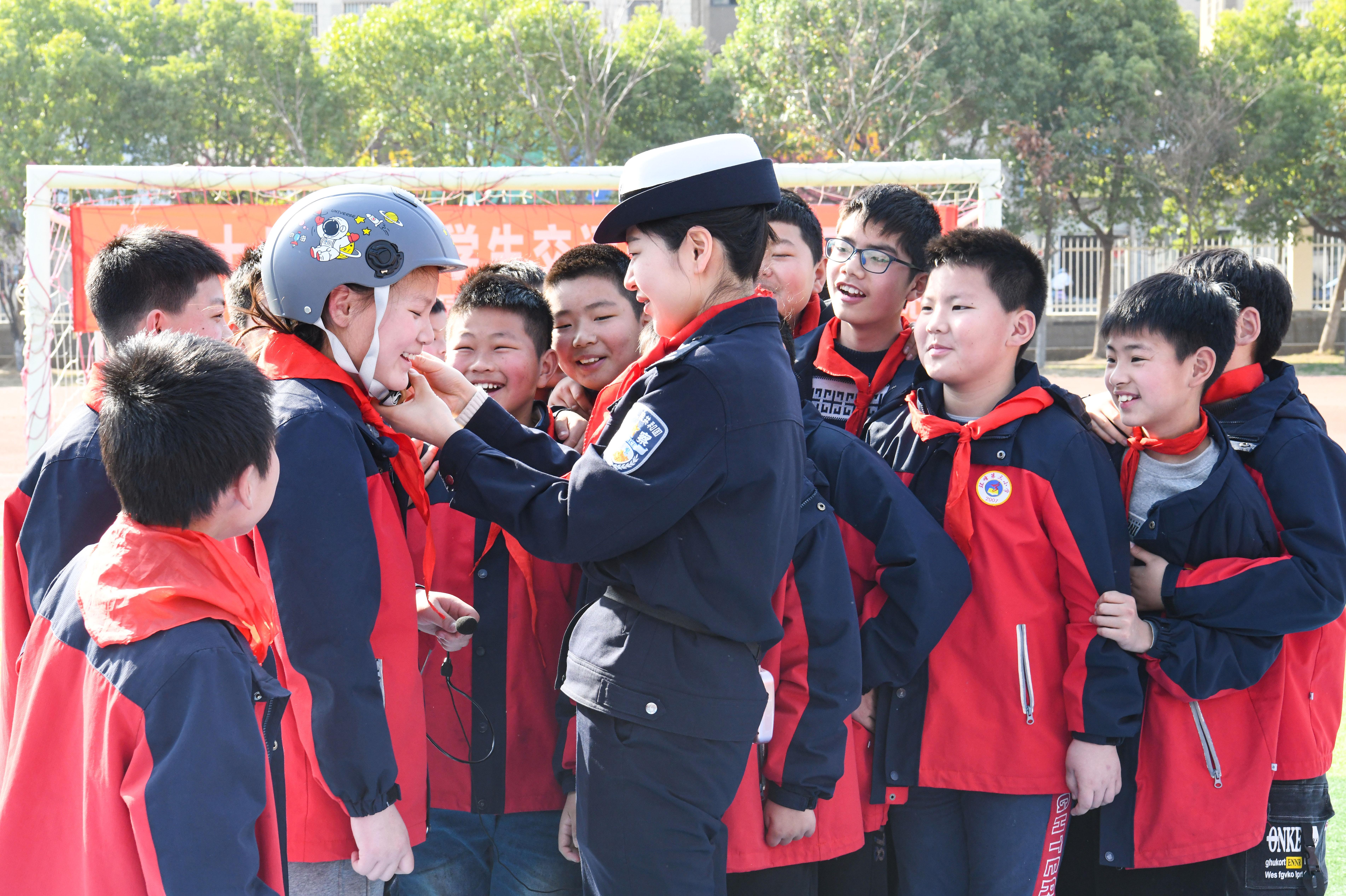 3月27日,安徽省含山縣公安局交管大隊(duì)組織民警走進(jìn)環(huán)峰第三小學(xué)開展以“大手拉小手 一起學(xué)交安”為主題的宣傳教育活動。民警根據(jù)現(xiàn)實(shí)生活中常見的一些交通違法行為,制作“交通安全游戲棋”,通過情景表演等形式,讓孩子們在寓教于樂中學(xué)習(xí)交通安全知識。圖為民警向?qū)W生講解安全頭盔的重要性。 本報(bào)通訊員 馮善軍 攝