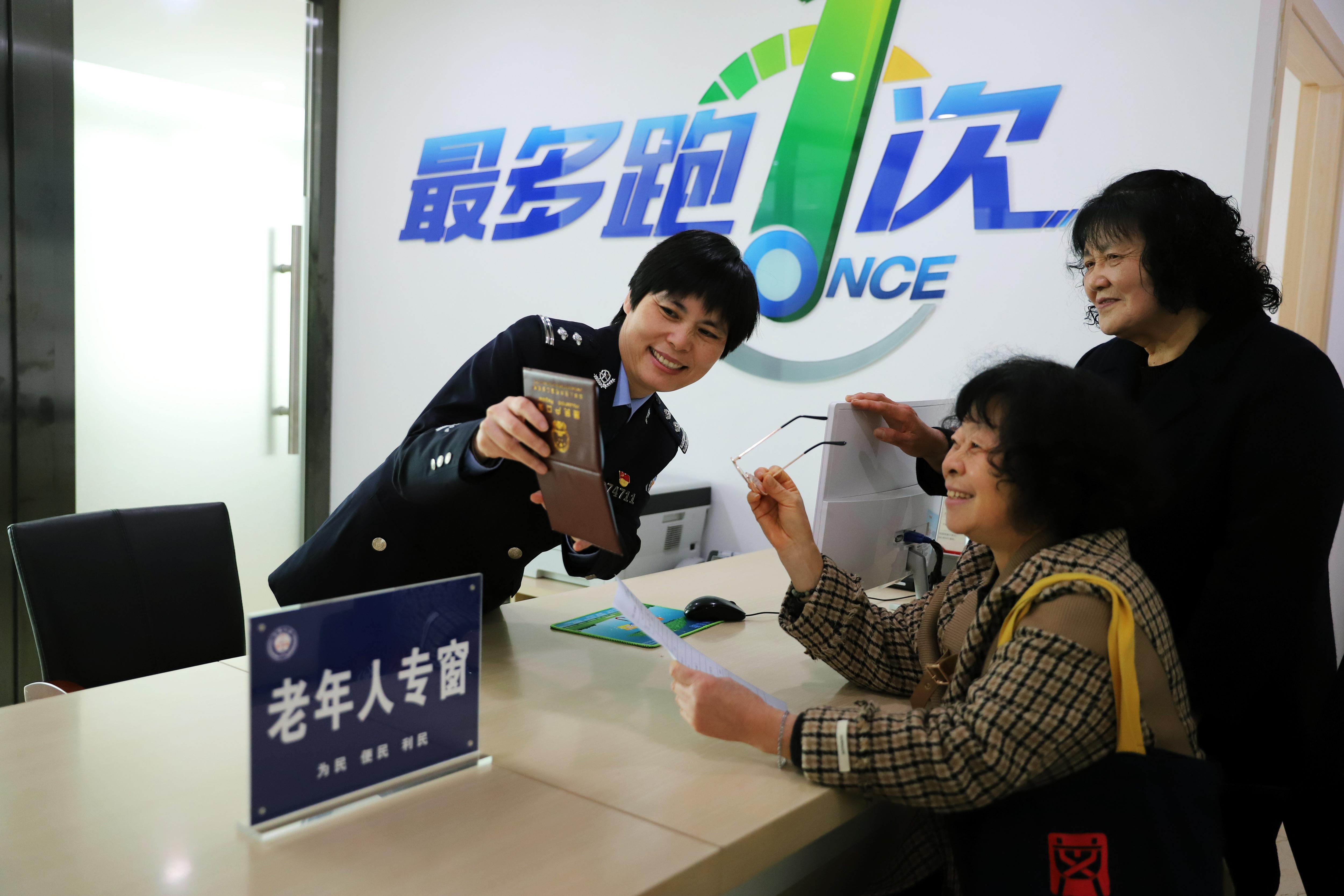 為方便老年人辦理業(yè)務(wù),今年以來(lái),浙江省臺(tái)州市公安局路橋分局各辦證窗口專(zhuān)門(mén)開(kāi)設(shè)老年人窗口,同時(shí)配備老花眼鏡等設(shè)施為老年人提供溫馨服務(wù)。圖為近日,路橋公安分局橫街派出所民警耐心為老年人辦理戶(hù)籍業(yè)務(wù)。本報(bào)通訊員 蔣友親 攝