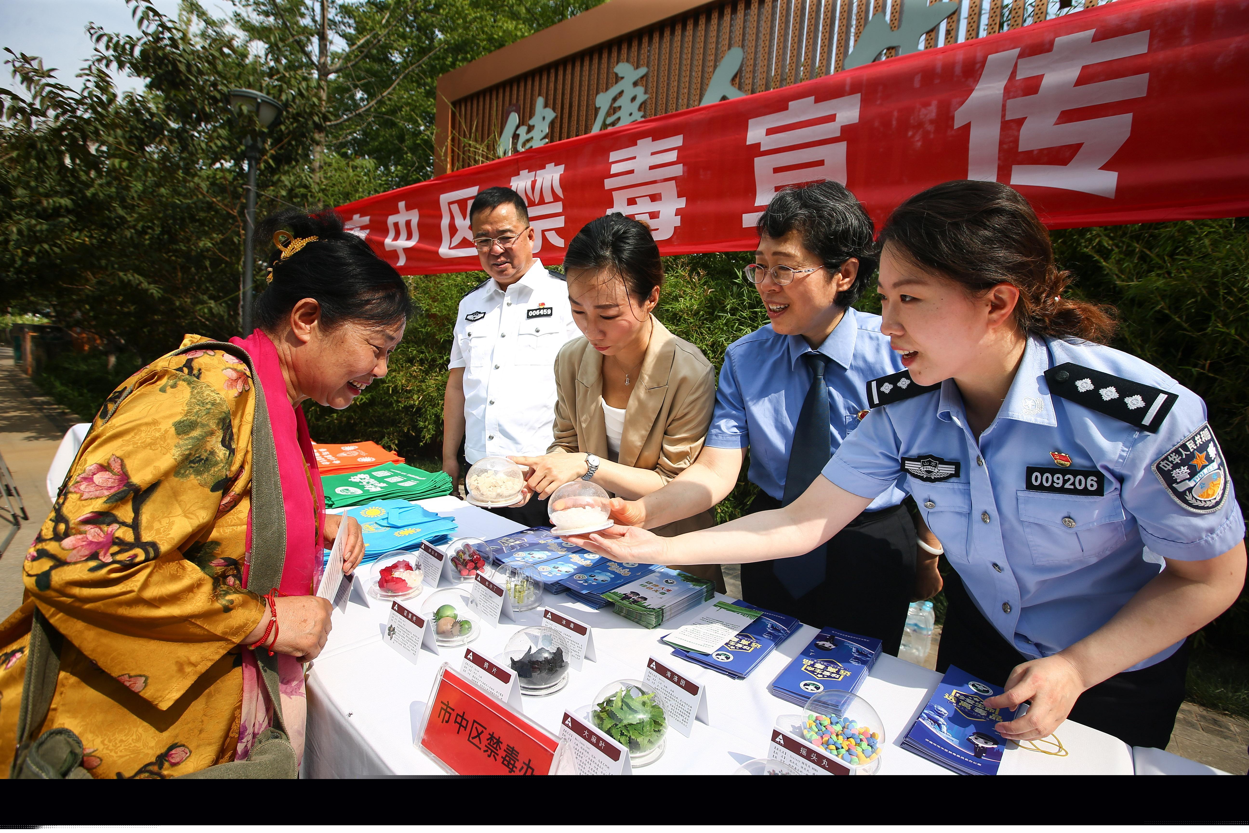 6月16日,山東省濟南市市中區(qū)禁毒辦聯(lián)合濟南市公安局市中區(qū)分局、市中區(qū)法院、市中區(qū)檢察院在轄區(qū)開展禁毒宣傳進社區(qū)活動。工作人員和志愿者通過設立宣傳展板,發(fā)放宣傳資料和展示仿真毒品模型等方式,向群眾普及禁毒知識,提升群眾禁毒意識。圖為工作人員向群眾展示仿真毒品模型。