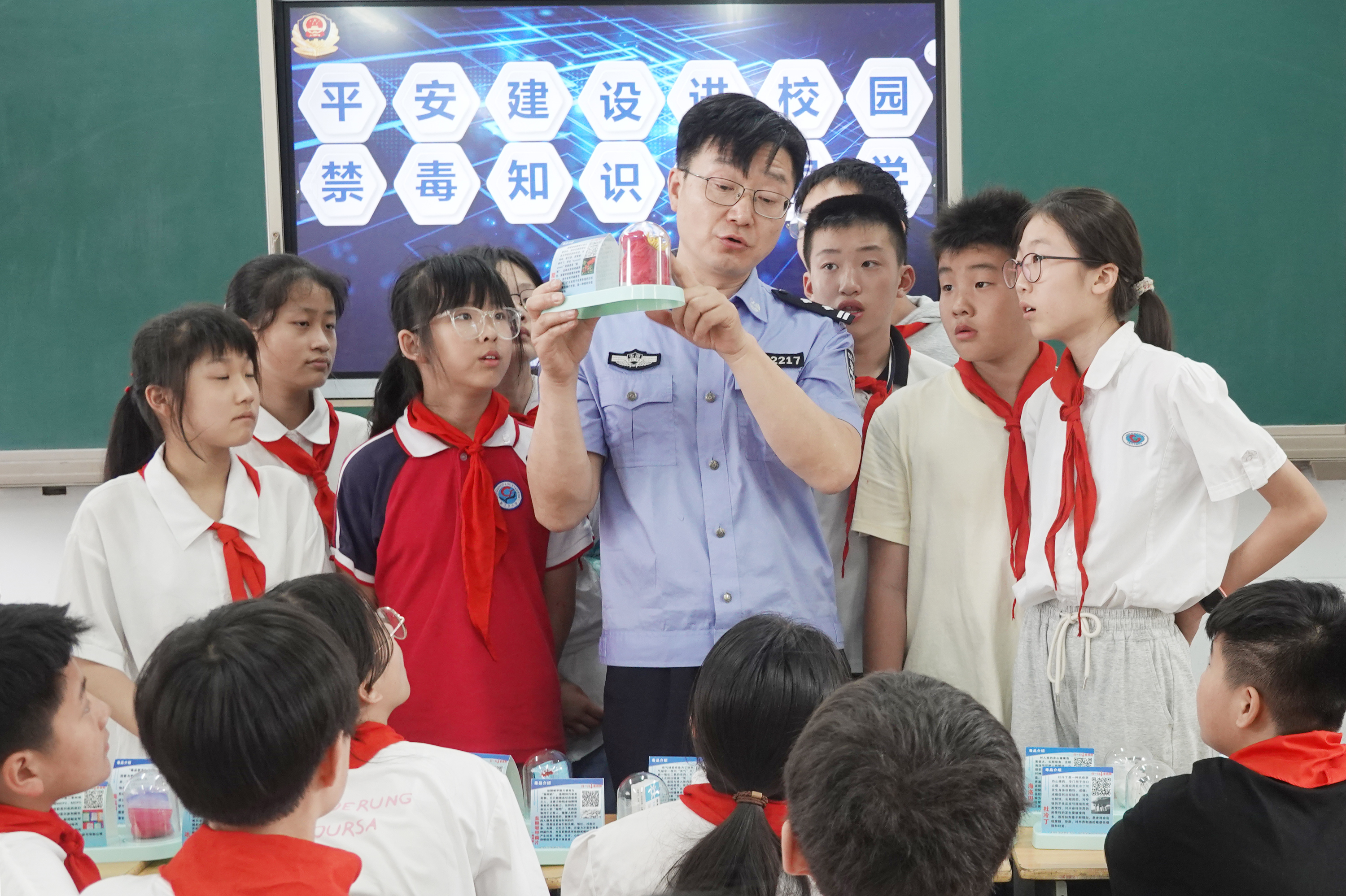 近日,安徽省馬鞍山市花山區(qū)金家莊街道新風社區(qū)工作人員和塘西派出所民警在新工房小學開展“平安建設進校園 禁毒知識大家學”活動,工作人員和派出所民警通過展示仿真毒品、播放禁毒宣傳視頻、發(fā)放禁毒宣傳書簽等方式,為學生講解新型毒品的危害,提醒他們提高自我保護意識。圖為民警向學生講解禁毒知識。 本報通訊員 胡智慧 攝