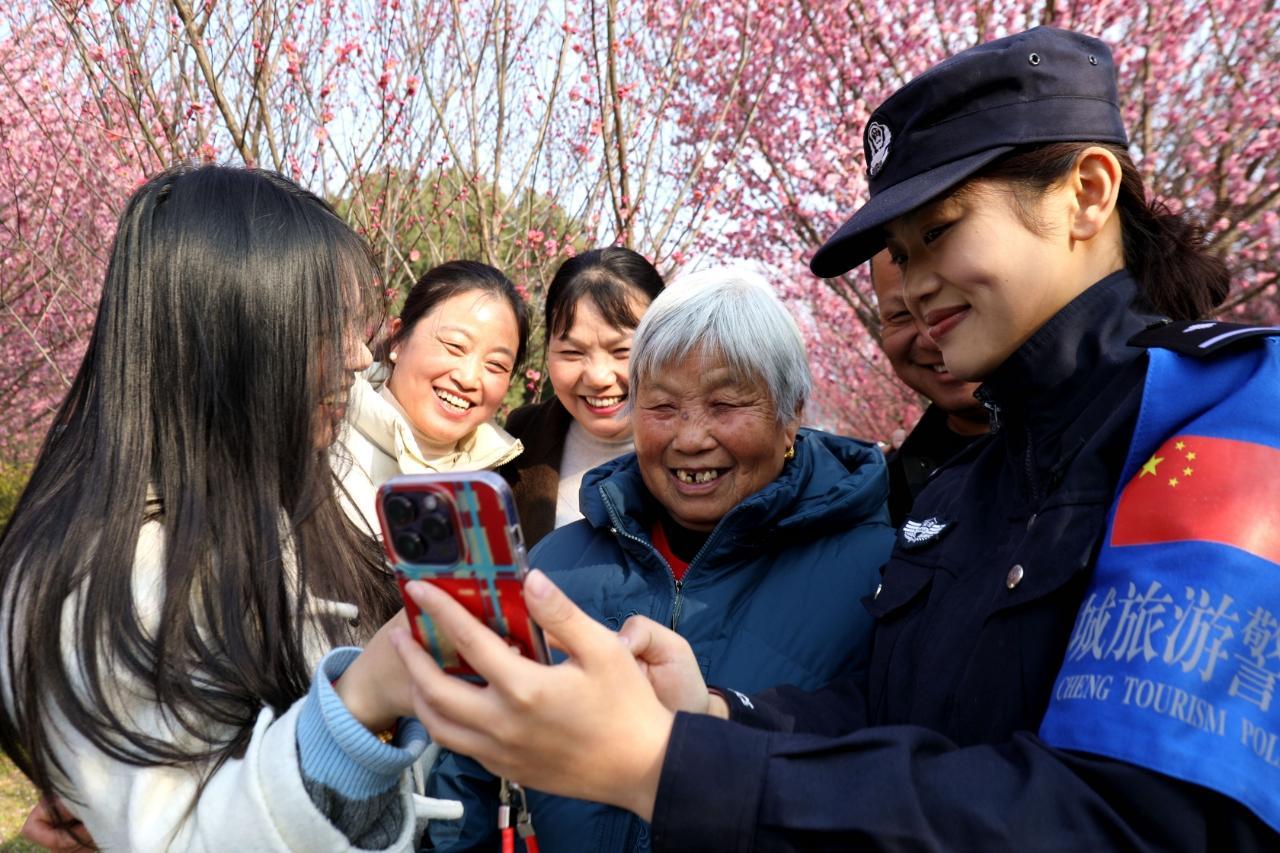 近日,安徽省舒城縣九一六茶園梅花綻放,春意盎然,成為眾多游客的賞花“打卡地”。舒城縣公安局舒茶派出所組織民輔警及時(shí)走進(jìn)景區(qū),開展巡邏守護(hù)、服務(wù)群眾。圖為民警展示為群眾拍攝的合影。