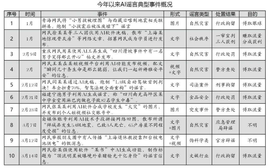 10起典型案例中,有4起AI謠言與自然災(zāi)害相關(guān),包括地震、山體滑坡等;2起謠言涉及食品安全和突發(fā)事件,分別為“四川某中學(xué)食堂用淋巴肉做包子致87名學(xué)生中毒”和“某地學(xué)校發(fā)生火災(zāi)”;還有4起謠言分別涉及偽科學(xué)、文娛行業(yè)、社會(huì)秩序和司法案件四個(gè)方面。AI謠言表現(xiàn)形式較多,大多通過微博、微信、短視頻等社交媒體渠道擴(kuò)散,并以文字、圖片、視頻形式單一或“搭配”傳播,比如“西藏定日縣地震一小孩被壓廢墟”謠言形式為圖片,“上海退休教授靠陽臺(tái)核電池供電”謠言則是以“文字+視頻”的形式傳播。造謠動(dòng)機(jī)方面,有8起事件明確提到造謠者是為了蹭熱點(diǎn)、賺取流量收益,可見流量經(jīng)濟(jì)仍然是AI謠言存在的底層邏輯。10起事件中,有2起事件被官方辟謠,但沒有其他情況通報(bào),其余8起均有明確處理結(jié)果。處置結(jié)果方面,10起事件中有5起事件的造謠者被公安機(jī)關(guān)給予行政處罰或行政拘留,有2起事件進(jìn)入到司法流程,網(wǎng)民閆某某因刻意炒作“國內(nèi)首例智能駕駛致死案”,被屬地警方刑事拘留;網(wǎng)民徐某某等3人散布“上海某地驚現(xiàn)骨灰房”等謠言,獲利數(shù)額較大,被上海當(dāng)?shù)胤ㄔ阂苑欠ń?jīng)營罪判處有期徒刑一年十個(gè)月不等。