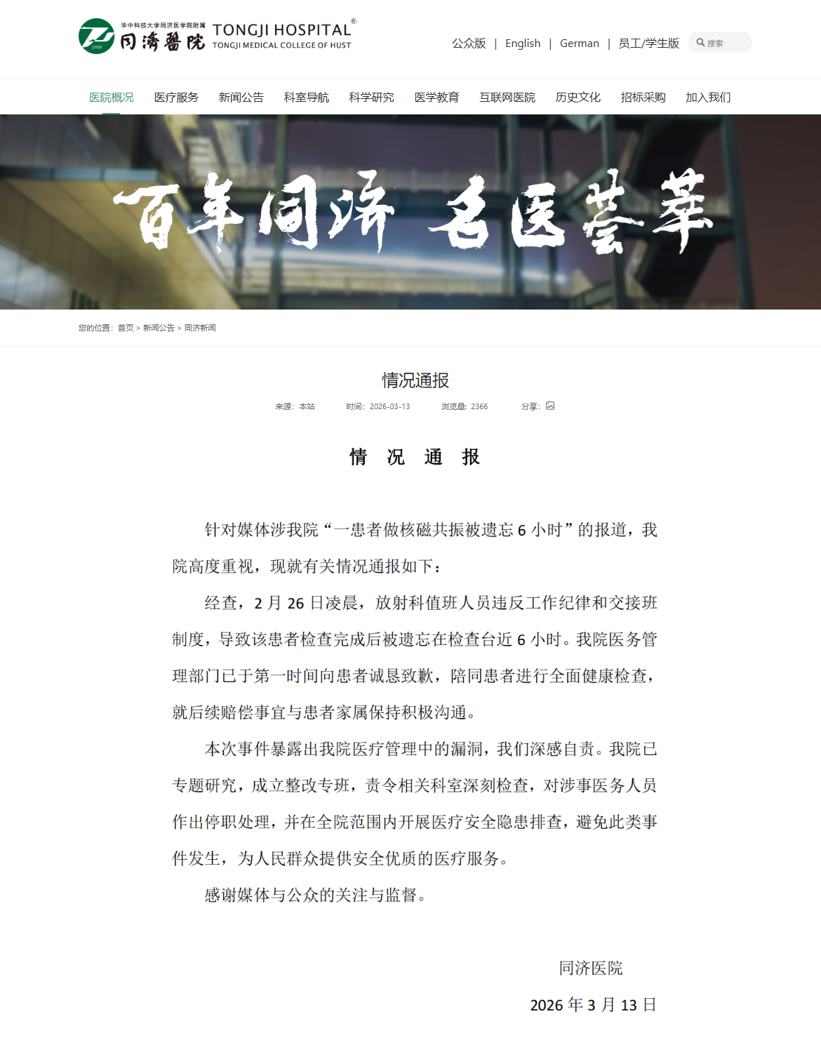 3月13日,針對(duì)“一患者做核磁共振被遺忘6小時(shí)”一事,華中科技大學(xué)同濟(jì)醫(yī)學(xué)院附屬同濟(jì)醫(yī)院發(fā)布情況通報(bào)。