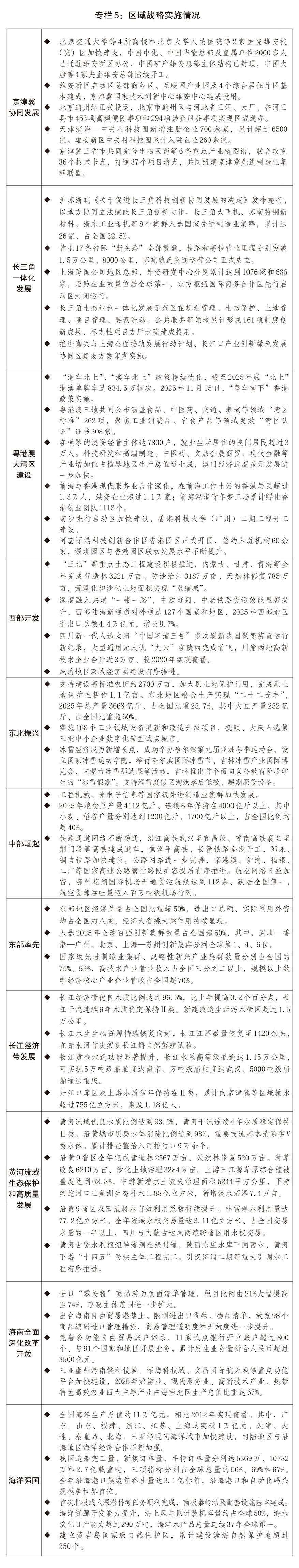 2025年是“十四五”收官之年。過去5年,以習(xí)近平同志為核心的黨中央團(tuán)結(jié)帶領(lǐng)全黨全國各族人民迎難而上、砥礪前行,經(jīng)受住世紀(jì)疫情嚴(yán)重沖擊,有效應(yīng)對一系列重大風(fēng)險挑戰(zhàn),“十四五”規(guī)劃主要目標(biāo)任務(wù)勝利完成,經(jīng)濟(jì)社會發(fā)展取得一系列具有開創(chuàng)性、突破性、標(biāo)志性的重大成就。經(jīng)濟(jì)發(fā)展實(shí)現(xiàn)歷史性跨越。2025年經(jīng)濟(jì)總量比2020年增長超過35%,對世界經(jīng)濟(jì)增長貢獻(xiàn)保持在30%左右;制造業(yè)增加值比2020年增長31%,規(guī)模連續(xù)16年全球第一;國家綜合立體交通網(wǎng)主骨架建成率超過90%;制造業(yè)投資實(shí)現(xiàn)7.7%的年均增長;常住人口城鎮(zhèn)化率比2020年末提高4個百分點(diǎn)。創(chuàng)新驅(qū)動取得重大突破。全社會研發(fā)經(jīng)費(fèi)投入總量達(dá)到3.9萬億元,一批關(guān)鍵核心技術(shù)攻關(guān)實(shí)現(xiàn)突破,第一艘國產(chǎn)電磁彈射航母福建艦下水,全球第一座第四代核電站石島灣基地投入商業(yè)運(yùn)行,國產(chǎn)大飛機(jī)C919第一次實(shí)現(xiàn)商業(yè)運(yùn)營,若干“國之重器”站上創(chuàng)新制高點(diǎn);科技創(chuàng)新推動產(chǎn)業(yè)加快升級,技術(shù)合同成交額約為2020年的2.67倍,集成電路成為單一商品出口第一,工業(yè)機(jī)器人、無人機(jī)等產(chǎn)量位居世界首位。民生保障扎實(shí)有力。城鄉(xiāng)居民收入比由2020年的2.56縮小至2.31;基本公共服務(wù)水平明顯提升,城鄉(xiāng)居民全國基礎(chǔ)養(yǎng)老金最低標(biāo)準(zhǔn)、基本醫(yī)療保險人均財政補(bǔ)助標(biāo)準(zhǔn)分別比2020年提高53.8%、27.3%,勞動年齡人口平均受教育年限、人均預(yù)期壽命比2020年分別增加0.5年、1年以上。綠色發(fā)展底色更加鮮明。“增綠”全球最多,森林覆蓋率超過25%,新增森林面積貢獻(xiàn)全球新增綠化面積約25%;“治污”成效顯著,地級及以上城市空氣質(zhì)量優(yōu)良天數(shù)比例比2020年提高2.3個百分點(diǎn),長江、黃河干流全線連續(xù)多年保持在Ⅱ類水質(zhì)標(biāo)準(zhǔn);“用能”更加清潔,新能源發(fā)電裝機(jī)規(guī)模歷史性超過煤電,構(gòu)建起全球最大的可再生能源體系。安全保障能力明顯增強(qiáng)。糧食、能源、產(chǎn)業(yè)等安全基礎(chǔ)進(jìn)一步夯實(shí),應(yīng)急救災(zāi)能力越來越強(qiáng),國防實(shí)力和經(jīng)濟(jì)實(shí)力同步提升,防范化解風(fēng)險、抵御沖擊挑戰(zhàn)、捍衛(wèi)國家和人民利益的能力不斷提高。治理效能和大國擔(dān)當(dāng)充分彰顯。全國統(tǒng)一大市場加快構(gòu)建,民營企業(yè)數(shù)量比2020年增長超過40%,制造業(yè)外資準(zhǔn)入限制“清零”。堅定履行“雙碳”承諾,單位國內(nèi)生產(chǎn)總值碳排放累計降低17.7%。高質(zhì)量共建“一帶一路”不斷走深走實(shí),合作范圍擴(kuò)大到150多個國家和30多個國際組織,多領(lǐng)域合作取得重大進(jìn)展和成效。