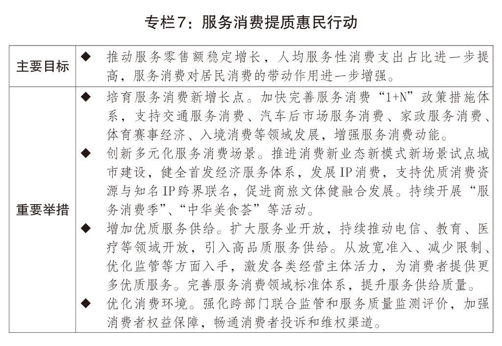 清理消費(fèi)領(lǐng)域不合理限制措施。分年限保障“久搖不中”無車家庭購車需求,完善郵輪游艇、汽車改裝、房車露營、航空飛行營地等行業(yè)標(biāo)準(zhǔn)和管理機(jī)制,簡化賽事等大型活動審批,豐富戶外運(yùn)動項(xiàng)目和賽事活動供給,鼓勵熱門旅游景區(qū)、有條件的文博體場館延長開放時間,釋放文旅、賽事、康養(yǎng)等領(lǐng)域消費(fèi)潛力。支持有條件的地方推廣中小學(xué)春秋假,落實(shí)職工帶薪錯峰休假制度。實(shí)施充電設(shè)施“三年倍增”行動,加快充電樁、停車場、旅游公路等消費(fèi)基礎(chǔ)設(shè)施建設(shè)。完善農(nóng)村物流配送網(wǎng)絡(luò),推動優(yōu)質(zhì)消費(fèi)品進(jìn)入農(nóng)村市場。深入推進(jìn)國際消費(fèi)中心城市建設(shè),開展國際化消費(fèi)環(huán)境建設(shè)試點(diǎn),提升入境消費(fèi)便利化國際化水平,大力發(fā)展入境旅游,打造“購在中國”品牌。推動一刻鐘便民生活圈擴(kuò)圍升級,優(yōu)化社區(qū)消費(fèi)條件。加大消費(fèi)者權(quán)益保護(hù)力度,加強(qiáng)直播帶貨等領(lǐng)域監(jiān)管。