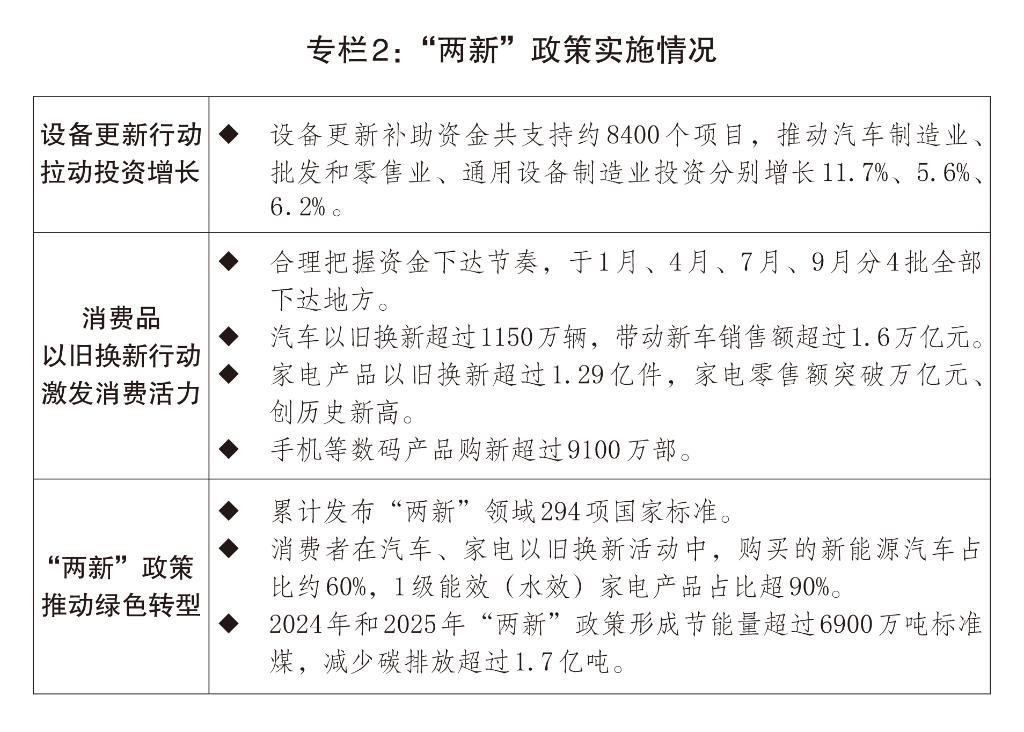 一是消費(fèi)市場擴(kuò)容升級亮點(diǎn)紛呈。實(shí)施提振消費(fèi)專項(xiàng)行動,社會消費(fèi)品零售總額增長3.7%。汽車銷量突破3440萬輛,新能源汽車銷量達(dá)到1649萬輛、增長28.2%。降低住房貸款首付比例、個人住房公積金貸款利率,引導(dǎo)商業(yè)性房貸利率下降,支持提取住房公積金用于支付購房首付款。智能可穿戴設(shè)備、掃地機(jī)器人、無人機(jī)等產(chǎn)品消費(fèi)勢頭良好。即時零售、直播電商等持續(xù)發(fā)展,全年網(wǎng)上零售額、快遞業(yè)務(wù)量分別增長8.6%、13.6%。深入推動新能源汽車、綠色智能家電等下鄉(xiāng),鄉(xiāng)村消費(fèi)品零售額增長4.1%。開展服務(wù)消費(fèi)提質(zhì)惠民行動、促進(jìn)健康消費(fèi)專項(xiàng)行動,增開銀發(fā)旅游列車,服務(wù)零售額增長5.5%。支持影視、動漫、舞臺藝術(shù)等領(lǐng)域精品創(chuàng)作,有序延長熱門文博場館、旅游景區(qū)營業(yè)時間,支持舉辦“蘇超”、“浙BA”、“冰超”等大眾體育賽事,促進(jìn)冰雪經(jīng)濟(jì)發(fā)展。支持首發(fā)經(jīng)濟(jì),打造國貨“潮牌”、“潮品”,推動全國中華老字號擴(kuò)圍至1450個。探索建立中小學(xué)春秋假制度。積極擴(kuò)大入境消費(fèi),全年入境游客15450萬人次、入境游客總花費(fèi)1311億美元,分別增長17.1%、39.2%。優(yōu)化離境退稅政策,離境退稅商品銷售額增長近一倍。