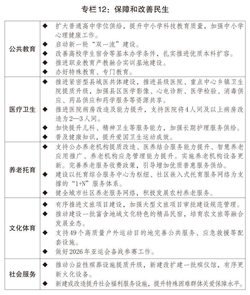 二是構(gòu)建優(yōu)質(zhì)均衡公共服務(wù)體系。穩(wěn)步推進(jìn)基本公共服務(wù)均等化。適應(yīng)學(xué)齡人口變化,優(yōu)化學(xué)前和義務(wù)教育資源配置,增加普通高中學(xué)位供給和優(yōu)質(zhì)高校本科招生。全面推進(jìn)健康學(xué)校建設(shè)。深化實(shí)施醫(yī)療衛(wèi)生強(qiáng)基工程,完善國家區(qū)域醫(yī)療中心管理體制和運(yùn)行機(jī)制,促進(jìn)優(yōu)質(zhì)醫(yī)療資源擴(kuò)容下沉和區(qū)域均衡布局,加強(qiáng)縣區(qū)、基層醫(yī)療機(jī)構(gòu)運(yùn)行保障。支持心理健康和精神衛(wèi)生、婦女兒童健康服務(wù)體系建設(shè),實(shí)施康復(fù)護(hù)理擴(kuò)容提升工程。健全公共衛(wèi)生防控救治體系。加強(qiáng)慢性病、罕見病防治,全方位提升急診急救、血液保障和應(yīng)急能力。推進(jìn)中醫(yī)藥傳承創(chuàng)新,促進(jìn)中西醫(yī)結(jié)合。推出促進(jìn)銀發(fā)經(jīng)濟(jì)高質(zhì)量發(fā)展的增量政策,培育發(fā)展銀發(fā)經(jīng)濟(jì)龍頭企業(yè),推進(jìn)老年人力資源開發(fā),更好滿足老年人多元化需求。發(fā)展醫(yī)養(yǎng)結(jié)合服務(wù),推行長期護(hù)理保險,健全失能失智老年人照護(hù)體系。實(shí)施早孕關(guān)愛行動、孕育和出生缺陷防治能力提升計劃。發(fā)揮育兒補(bǔ)貼作用,完善生育保險、生育休假等制度。推進(jìn)普惠養(yǎng)老托育服務(wù)體系建設(shè),提升社區(qū)養(yǎng)老托育等服務(wù)能力。加強(qiáng)公共設(shè)施適老化和無障礙改造。推進(jìn)高質(zhì)量戶外運(yùn)動目的地建設(shè),開展群眾身邊體育運(yùn)動空間擴(kuò)容。積極培育群眾賽事。深化家政產(chǎn)教融合,持續(xù)推進(jìn)家政服務(wù)業(yè)提質(zhì)擴(kuò)容。完善困境兒童服務(wù)保障體系,支持社會福利設(shè)施建設(shè)。