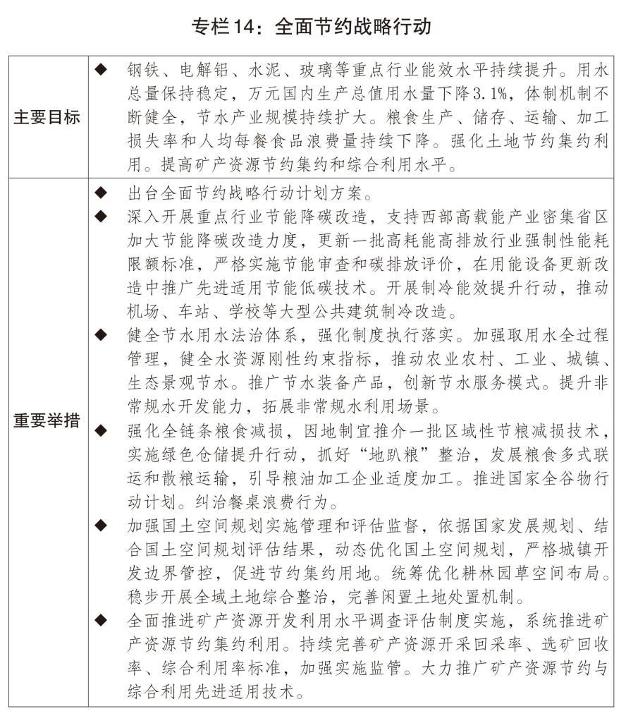 三是全面節(jié)約戰(zhàn)略實(shí)施成效明顯。統(tǒng)籌推進(jìn)“能水糧地礦材”一體化節(jié)約。有力有效管控高耗能高排放項(xiàng)目,深入實(shí)施重點(diǎn)領(lǐng)域節(jié)能降碳專項(xiàng)行動,加快存量項(xiàng)目改造升級和依規(guī)淘汰,制修訂24項(xiàng)能效能耗強(qiáng)制性國家標(biāo)準(zhǔn),扣除原料用能和非化石能源消費(fèi)量后的單位國內(nèi)生產(chǎn)總值能耗降低5.1%。建立健全農(nóng)業(yè)節(jié)水增效、工業(yè)節(jié)水減排、城鎮(zhèn)節(jié)水降損制度體系,加強(qiáng)再生水等非常規(guī)水利用,萬元國內(nèi)生產(chǎn)總值用水量下降4%左右。深入開展糧食節(jié)約和反食品浪費(fèi)行動,強(qiáng)化全鏈條糧食減損和餐飲行業(yè)反浪費(fèi)。大力發(fā)展循環(huán)經(jīng)濟(jì),加快構(gòu)建廢棄物循環(huán)利用體系,提高資源綜合利用水平,廢鋼鐵、廢有色金屬等10種主要再生資源回收量超過4億噸,大宗固體廢物綜合利用率超60%,主要資源產(chǎn)出率進(jìn)一步提高。