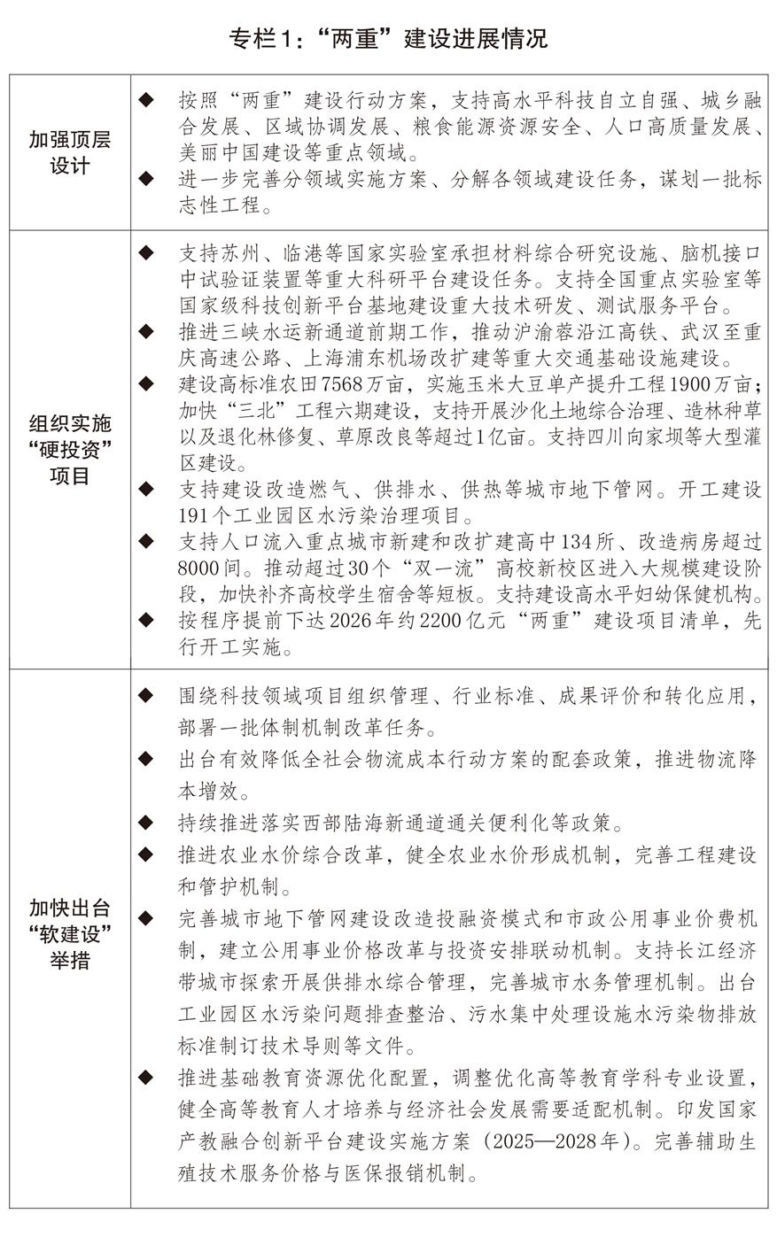 二是“兩重”建設(shè)接續(xù)推進(jìn)。強(qiáng)化“兩重”性質(zhì)、堅持自上而下、注重軟硬結(jié)合,高質(zhì)量推進(jìn)國家重大戰(zhàn)略和重點(diǎn)領(lǐng)域安全能力項(xiàng)目建設(shè)。加快“硬投資”項(xiàng)目實(shí)施,安排超長期特別國債8000億元,支持1459個重大項(xiàng)目,督促加快開工建設(shè),推動形成更多實(shí)物工作量。建立超長期貸款配套支持“兩重”建設(shè)工作機(jī)制,加大項(xiàng)目融資支持力度。加力推進(jìn)規(guī)劃編制、政策制定、體制機(jī)制創(chuàng)新等“軟建設(shè)”配套措施,完善項(xiàng)目投融資和價費(fèi)、工程建設(shè)管理和運(yùn)行管護(hù)等機(jī)制。