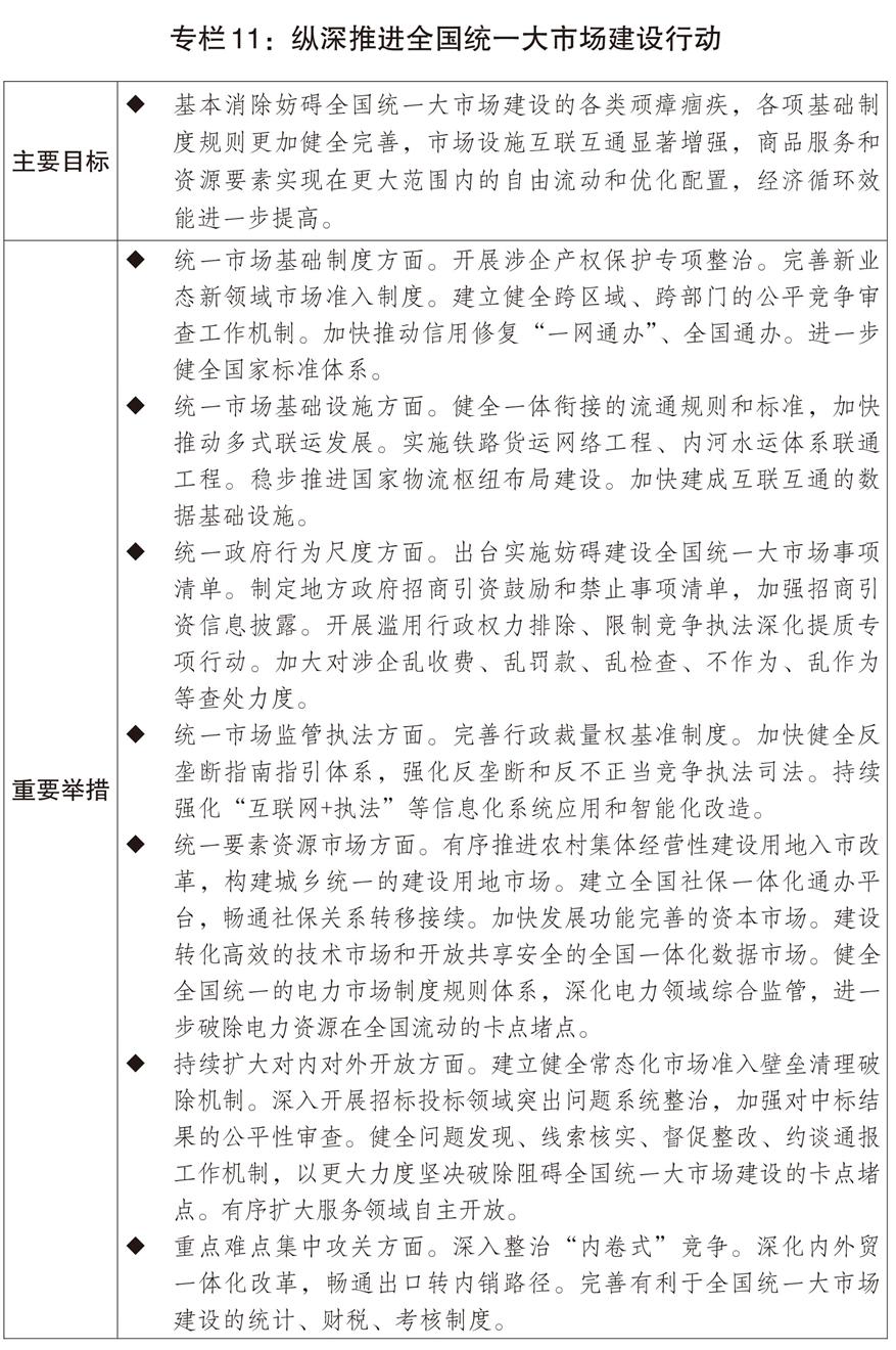 一是加快破除阻礙全國統(tǒng)一大市場建設(shè)卡點(diǎn)堵點(diǎn)。制定全國統(tǒng)一大市場建設(shè)條例、縱深推進(jìn)全國統(tǒng)一大市場建設(shè)工作方案,持續(xù)清理和廢除妨礙全國統(tǒng)一市場和公平競爭的各種規(guī)定和做法。推動市場準(zhǔn)入效能評估省、市、縣三級全覆蓋。出臺地方政府招商引資鼓勵和禁止事項(xiàng)清單,規(guī)范稅收優(yōu)惠、財政補(bǔ)貼政策。深化綜合交通運(yùn)輸體系改革,持續(xù)降低全社會物流成本,健全高效順暢的現(xiàn)代流通體系,加快市場基礎(chǔ)設(shè)施高標(biāo)準(zhǔn)聯(lián)通相關(guān)改革,實(shí)施多式聯(lián)運(yùn)攻堅行動,深入推進(jìn)“一單制”、“一箱制”發(fā)展。繼續(xù)推動大宗商品骨干流通走廊建設(shè),加快建設(shè)大宗商品資源配置樞紐,提高國家物流樞紐、國家骨干冷鏈物流基地、國家郵政快遞樞紐的物流集散和區(qū)域輻射能力??v深推進(jìn)全國統(tǒng)一電力市場建設(shè)。加快推動制修訂社會信用建設(shè)法、價格法等。深化統(tǒng)計、財稅、考核制度改革,完善有利于全國統(tǒng)一大市場建設(shè)的激勵約束機(jī)制。