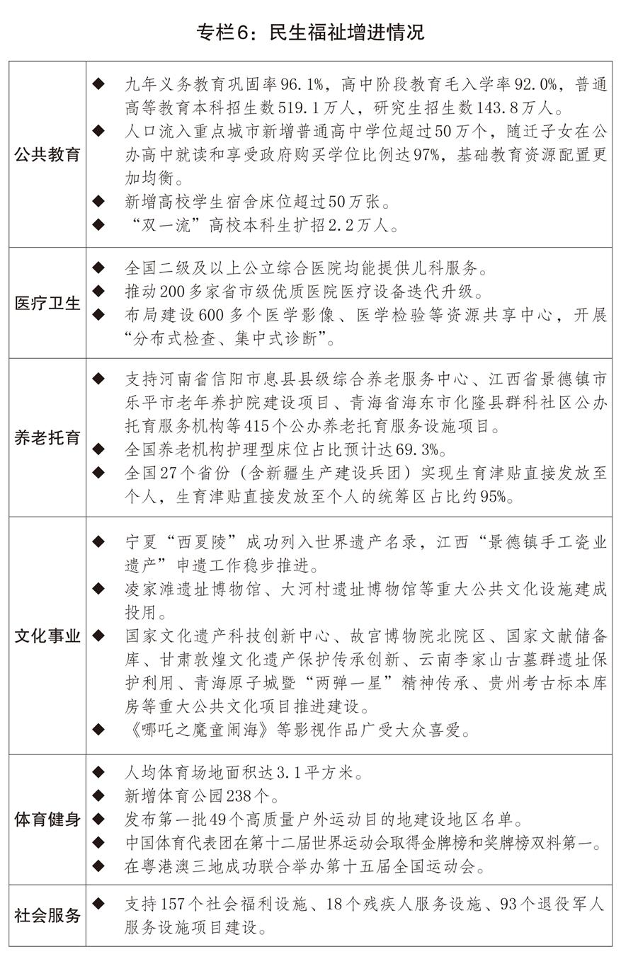 二是公共服務(wù)體系更加健全。國家基本公共服務(wù)項(xiàng)目基本實(shí)現(xiàn)城鄉(xiāng)標(biāo)準(zhǔn)統(tǒng)一、制度并軌。逐步推行免費(fèi)學(xué)前教育,2025年秋季學(xué)期起免除公辦幼兒園學(xué)前一年在園兒童保育教育費(fèi),對民辦園適齡兒童給予相應(yīng)減免。建立同人口變化相協(xié)調(diào)的基本公共教育服務(wù)供給機(jī)制,以人口流入地為重點(diǎn)加強(qiáng)普通高中建設(shè),支持“雙一流”建設(shè)高校提質(zhì)升級,扎實(shí)推進(jìn)優(yōu)質(zhì)本科擴(kuò)容,推動高校學(xué)科專業(yè)調(diào)整。實(shí)施醫(yī)療衛(wèi)生強(qiáng)基工程,推進(jìn)優(yōu)質(zhì)醫(yī)療資源向中西部等醫(yī)療資源薄弱地區(qū)有序輸出、定向放大,推動醫(yī)院病房改造和設(shè)備更新。加強(qiáng)公共衛(wèi)生防控救治體系建設(shè)。積極推動中醫(yī)藥振興發(fā)展。漸進(jìn)式延遲法定退休年齡改革穩(wěn)妥實(shí)施。促進(jìn)普惠養(yǎng)老服務(wù)高質(zhì)量發(fā)展,推進(jìn)醫(yī)養(yǎng)結(jié)合,提升養(yǎng)老服務(wù)機(jī)構(gòu)護(hù)理能力。大力發(fā)展銀發(fā)經(jīng)濟(jì)。以城市為單元整體推進(jìn)普惠托育服務(wù)發(fā)展。全面實(shí)施育兒補(bǔ)貼制度,對3周歲以下嬰幼兒每孩每年補(bǔ)貼3600元,并對補(bǔ)貼免征個人所得稅。完善全民健身公共服務(wù)體系,建設(shè)高質(zhì)量戶外運(yùn)動目的地,拓展全民健身空間場地。開展家政服務(wù)職業(yè)技能專項(xiàng)培訓(xùn)行動,促進(jìn)家政服務(wù)業(yè)提質(zhì)擴(kuò)容。加強(qiáng)困境兒童福利保障工作,推進(jìn)社會福利服務(wù)設(shè)施建設(shè)。健全退役軍人保障服務(wù)體系。加大公益性殯葬設(shè)施支持力度。