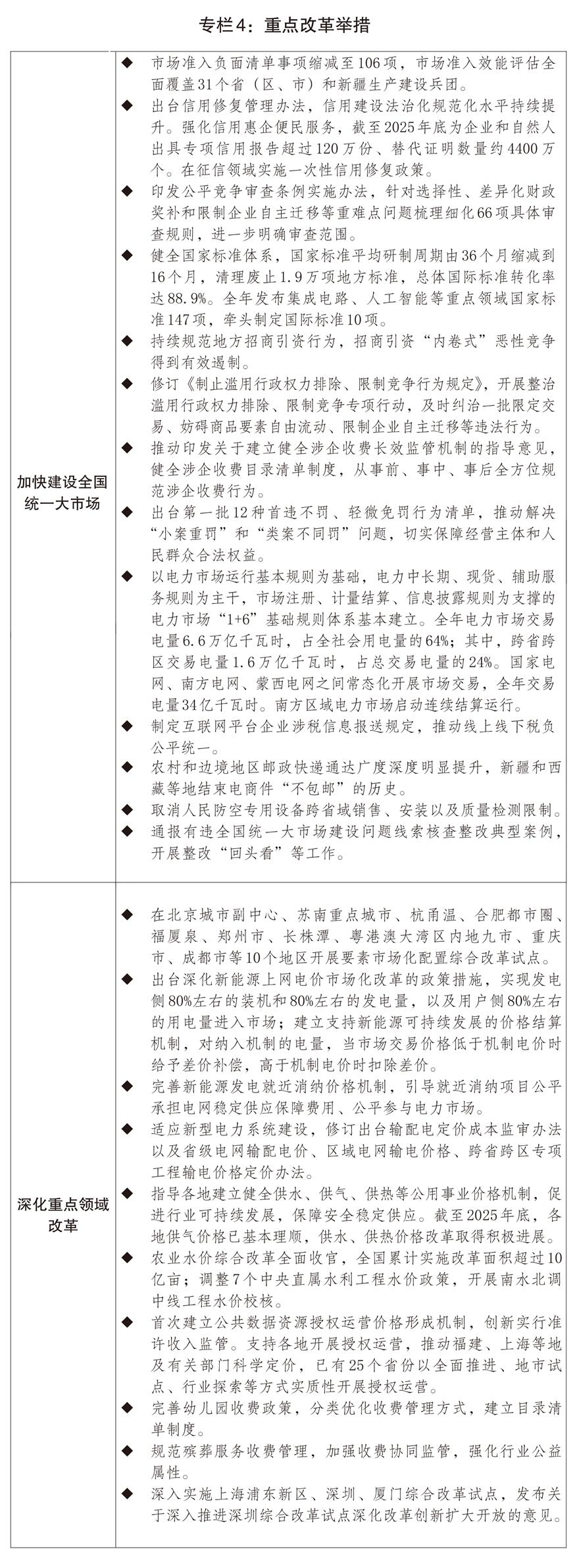 一是全國統(tǒng)一大市場建設(shè)向縱深推進(jìn)。實(shí)施全國統(tǒng)一大市場建設(shè)指引,出臺市場準(zhǔn)入負(fù)面清單(2025年版),清單事項(xiàng)縮減至106項(xiàng)。深入開展市場準(zhǔn)入壁壘清理整治行動,累計修訂或廢止相關(guān)文件2300余件。加快建設(shè)統(tǒng)一開放的交通運(yùn)輸市場,實(shí)施交通物流降本提質(zhì)增效行動計劃,市場設(shè)施聯(lián)通更加高效順暢。推動修訂反不正當(dāng)競爭法,出臺公平競爭審查條例實(shí)施辦法,開展整治濫用行政權(quán)力排除、限制競爭專項(xiàng)行動。持續(xù)規(guī)范地方招商引資行為,招商引資亂象得到有效遏制,地方制定實(shí)施政策的合規(guī)意識明顯增強(qiáng)。出臺健全社會信用體系的意見,構(gòu)建信用修復(fù)制度,建立企業(yè)信用狀況綜合評價體系,全面推行以專項(xiàng)信用報告替代有無違法違規(guī)記錄證明。全國統(tǒng)一電力市場體系初步建立,跨電網(wǎng)經(jīng)營區(qū)常態(tài)化電力交易機(jī)制基本建立,電力現(xiàn)貨市場基本覆蓋全國。