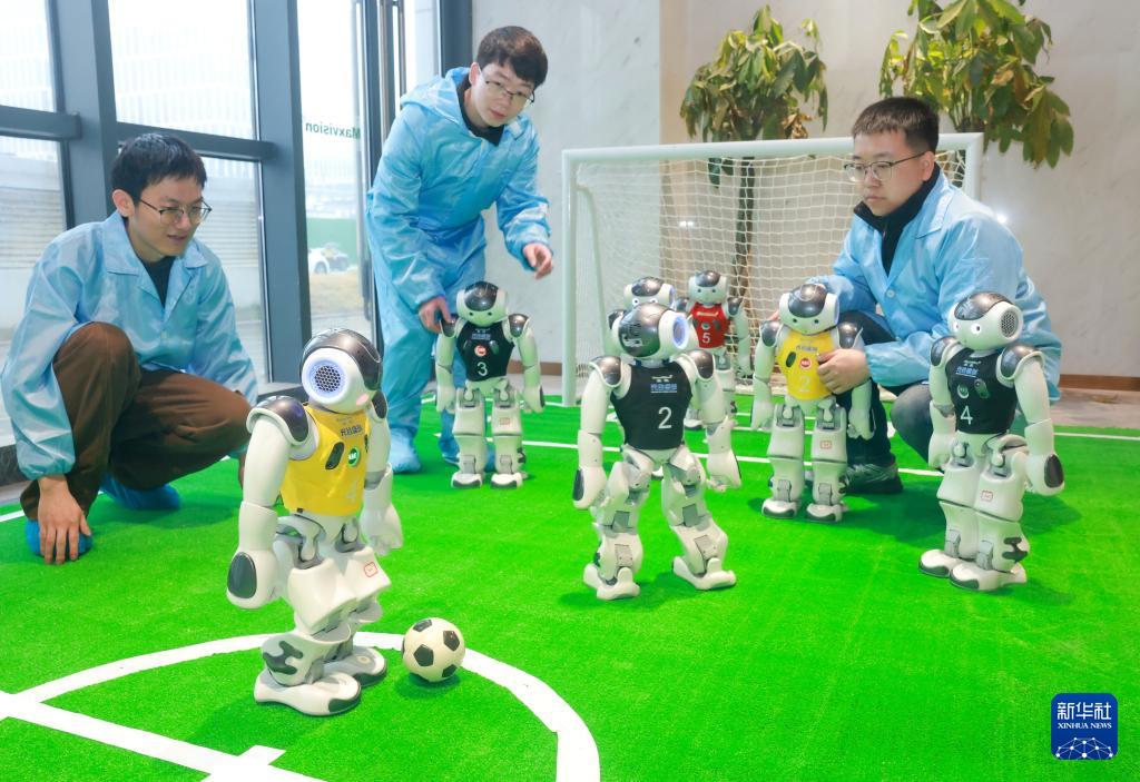 3月16日,湖北光谷盛創(chuàng)技術(shù)人員對(duì)機(jī)器人足球競(jìng)技對(duì)抗系統(tǒng)進(jìn)行調(diào)試。新華社發(fā)(趙軍攝)