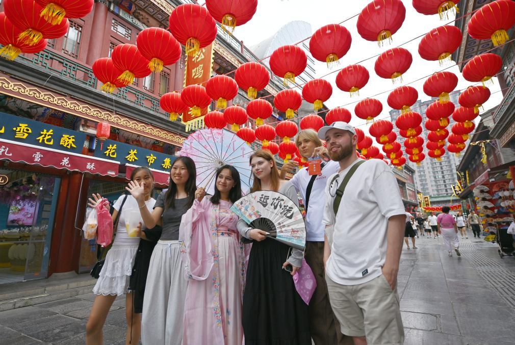 8月14日,上合組織國家學(xué)生在天津古文化街留影。新華社記者李然攝