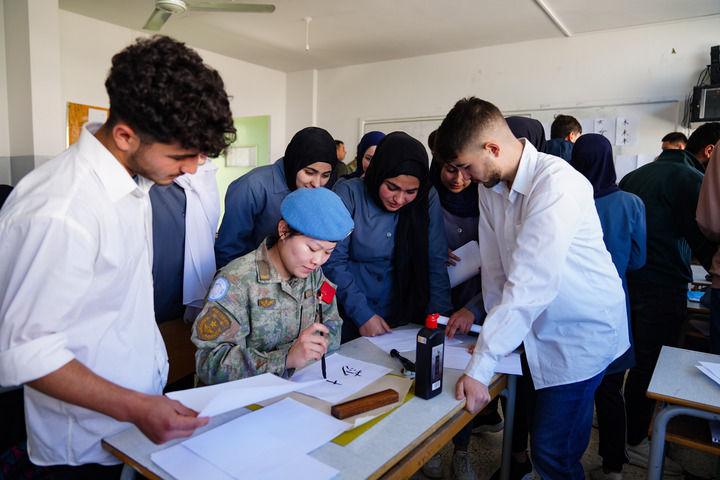 2023年4月3日,中國(guó)赴黎巴嫩維和多功能工兵分隊(duì)維和女兵韋薇在貝魯特拉赫曼·尤努斯中學(xué)用中文書寫學(xué)生名字。新華社發(fā)(李竹林?jǐn)z)