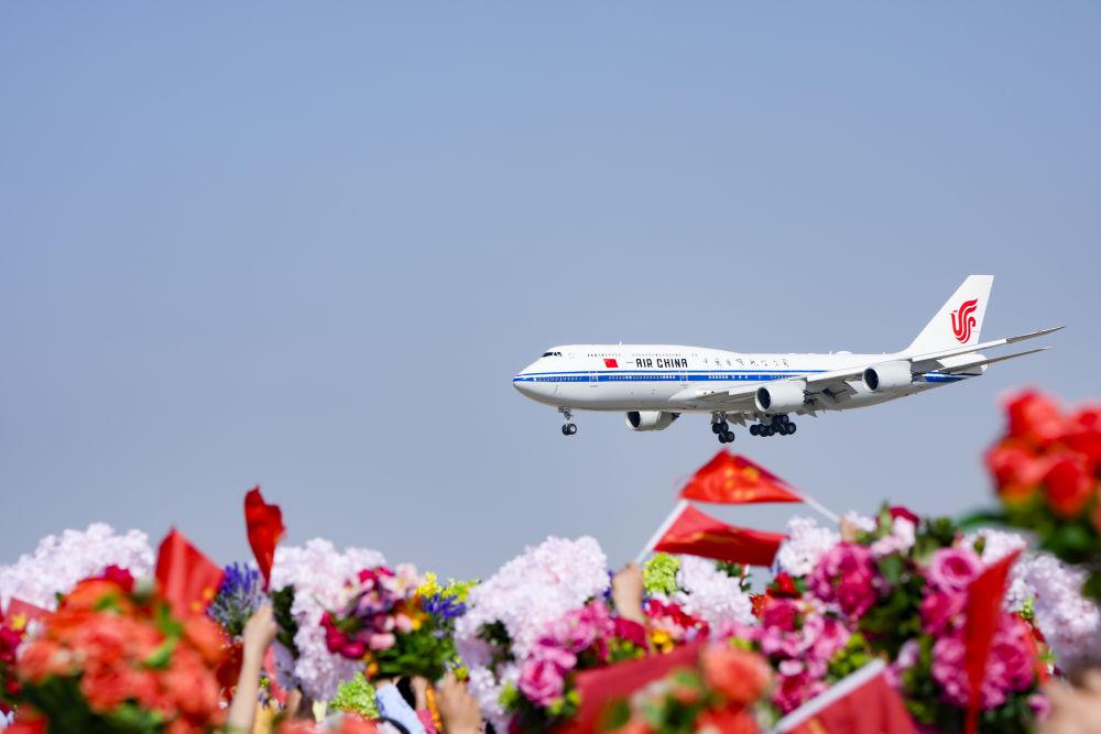 飛機(jī)沿著跑道滑行,飛向萬(wàn)里碧空。送別的人群,沉浸在幸福的喜悅中,久久不愿離去。