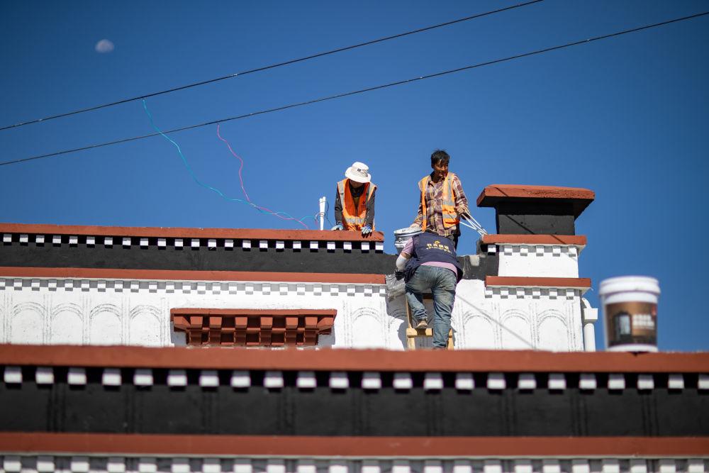 2025年8月11日,定日縣曲洛鄉(xiāng)措昂村彩繪工匠扎西、旦增貢加、拉巴在工作現(xiàn)場。他們都是本村受災(zāi)群眾,通過參與新房建設(shè)獲得勞動報(bào)酬。