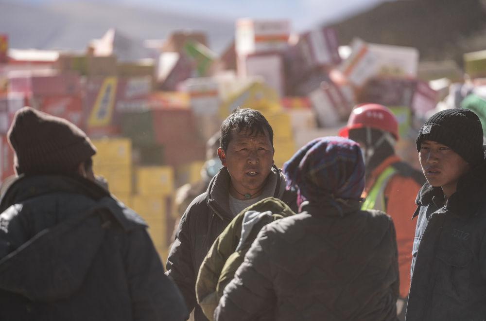 2025年1月10日,定日縣長所鄉(xiāng)古榮村黨支部書記次仁平措(中)協(xié)助群眾搬進(jìn)板房。