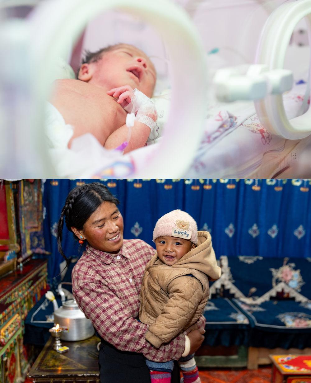 拼版照片:上圖為2025年1月9日,地震中第一個出生的“地震寶寶”次仁拉巴(1月8日7時40分左右出生)在日喀則市人民醫(yī)院新生兒科病房睡覺。下圖為2025年11月11日,次仁拉巴和媽媽強(qiáng)瓊在新房里。