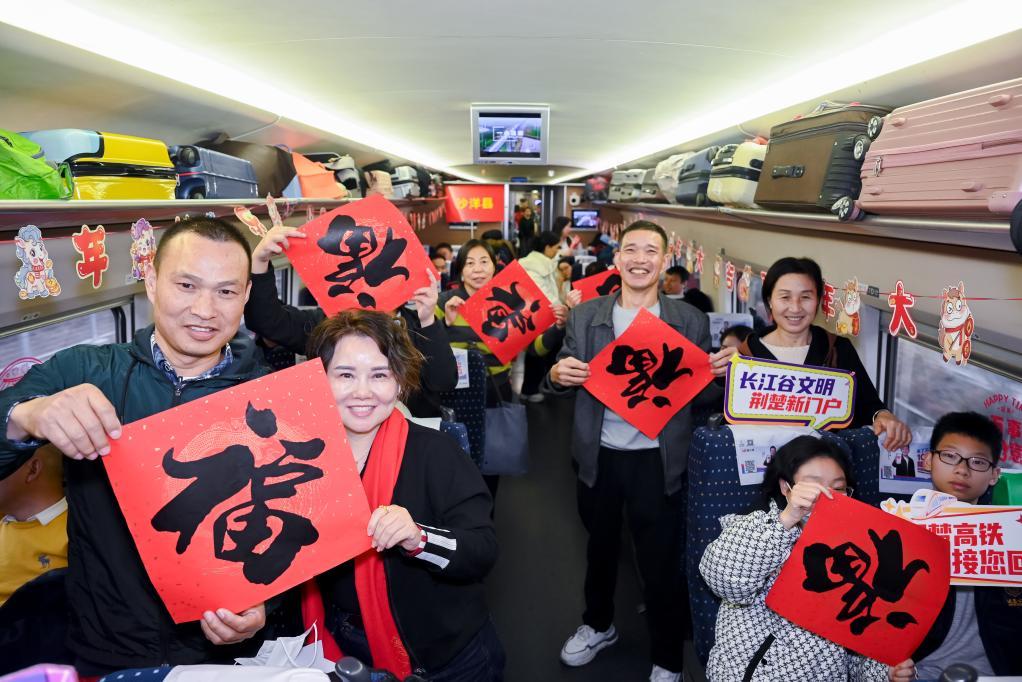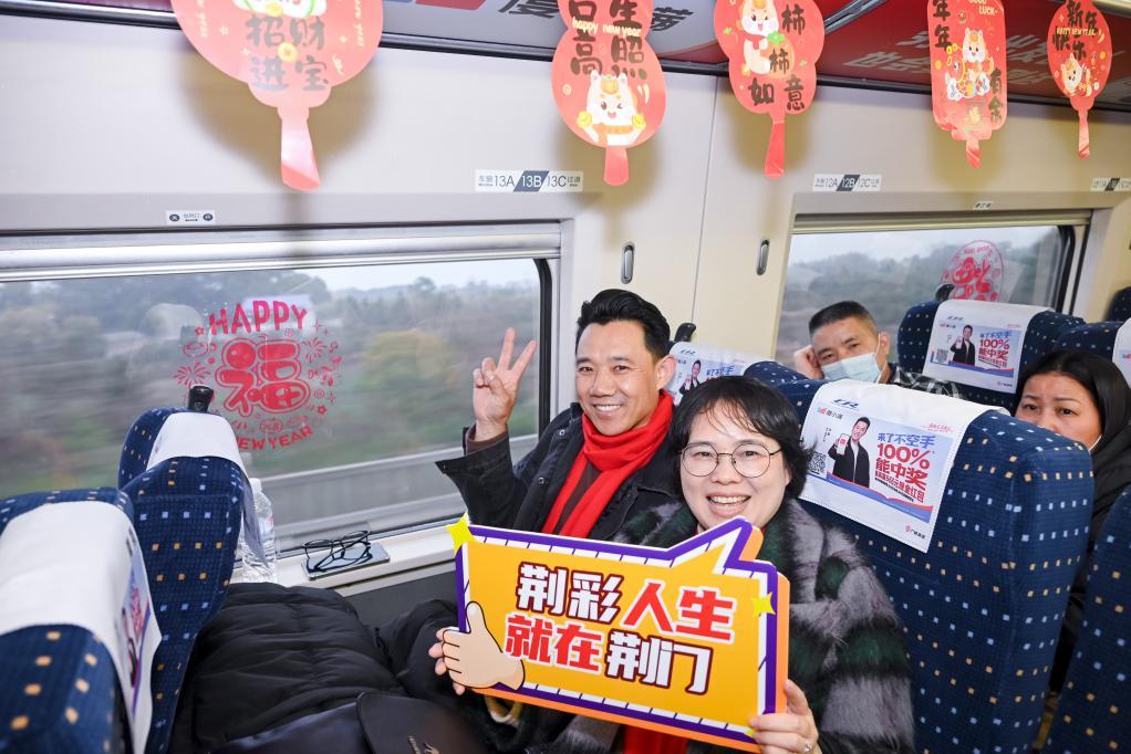 2月7日,G1136次列車(chē)上,歸鄉(xiāng)的湖北荊門(mén)人手持福字慶祝。(受訪(fǎng)者供圖)