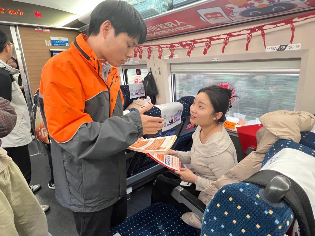 2月7日,G1136次列車(chē)上,湖北荊門(mén)的企業(yè)招聘專(zhuān)員向返鄉(xiāng)人員介紹企業(yè)招聘情況。(受訪(fǎng)者供圖)