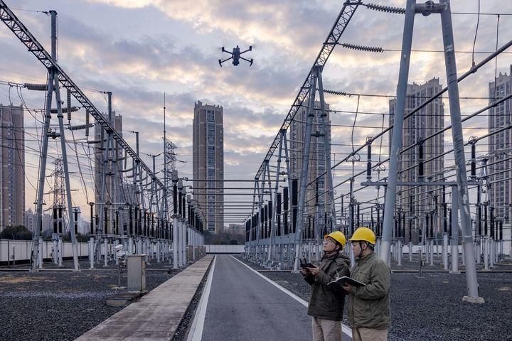2月17日,國網(wǎng)泰州供電公司運維人員在220千伏寺巷變電站利用無人機(jī)巡檢電力設(shè)備。新華社發(fā)(湯德宏 攝)