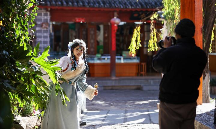 2026年1月13日,游客在麗江古城體驗(yàn)旅拍。新華社記者 江文耀 攝