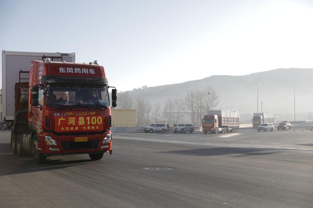 2023年12月26日,在甘肅省臨夏州積石山高速出口,載著活動板房的貨車駛向受災(zāi)鄉(xiāng)鎮(zhèn)。新華社記者 方欣 攝