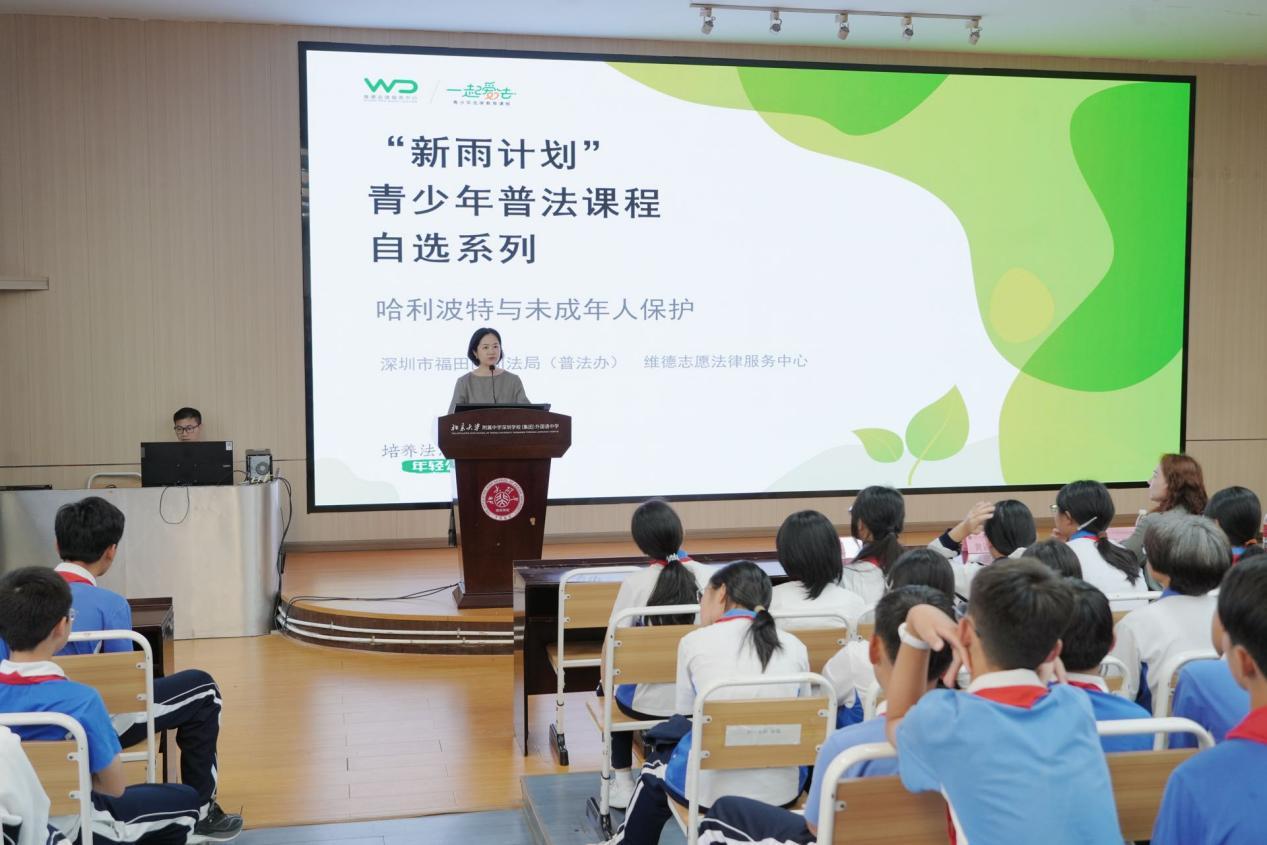 近日,北大附中深圳學(xué)校(集團(tuán))外國(guó)語(yǔ)中學(xué)報(bào)告廳內(nèi),一場(chǎng)別開(kāi)生面的“法治奇妙之旅”生動(dòng)開(kāi)講。為深入貫徹實(shí)施《中華人民共和國(guó)法治宣傳教育法》,廣東省深圳市福田區(qū)司法局(普法辦)充分發(fā)揮法治副校長(zhǎng)機(jī)制作用,選派分管負(fù)責(zé)同志出任該校法治副校長(zhǎng),并聯(lián)合福田區(qū)青少年普法“新雨計(jì)劃”資深普法志愿者、律師楊丹,為150余名初中學(xué)子帶來(lái)沉浸式法治教育盛宴。