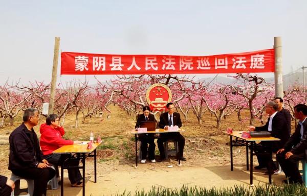圖為蒙陰法院垛莊法庭法官將一起買賣糾紛庭審設(shè)在桃園旁,就地開庭、現(xiàn)場調(diào)處。