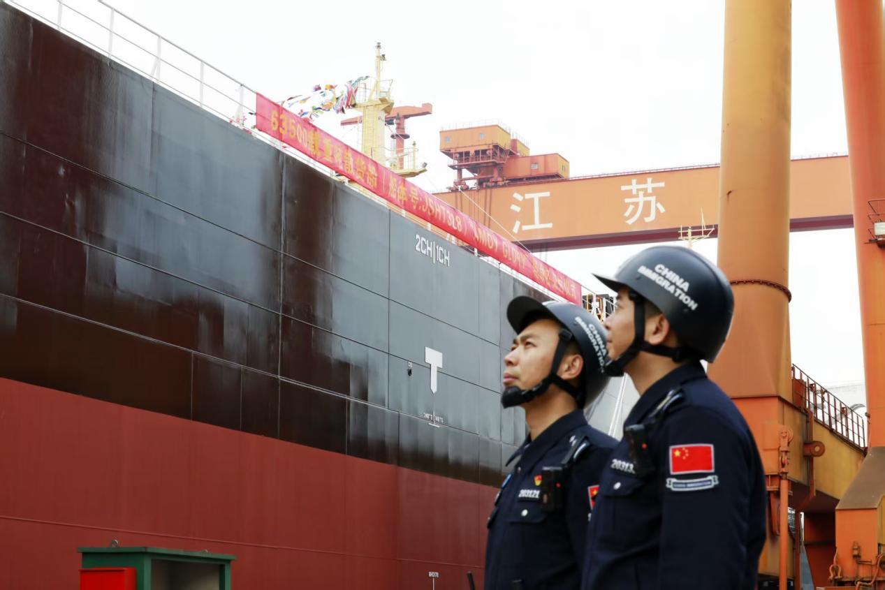 “針對新造船出口產(chǎn)業(yè)發(fā)展需求,我們量身定制了查驗(yàn)監(jiān)管和通關(guān)保障方案,提供‘一對一’的全流程服務(wù),精準(zhǔn)掌握船舶動態(tài)和手續(xù)辦理進(jìn)度,盡可能為企業(yè)節(jié)省時(shí)間,確保新造船能夠如期、順利交付啟航?!眻?zhí)勤一隊(duì)民警徐子超說。