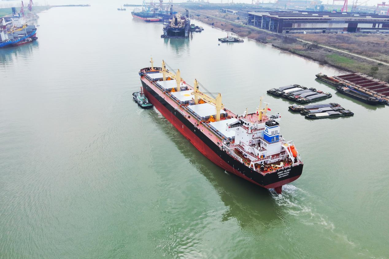 “這艘廈門榮耀輪,是我們本季度交付的第4艘貨輪,目前公司有6條散貨船正在建造過程中,按照全年的計(jì)劃今年將交付19艘貨船,共計(jì)110萬載重噸?!苯K海通海洋工程裝備有限公司行政部部長顧軍說。