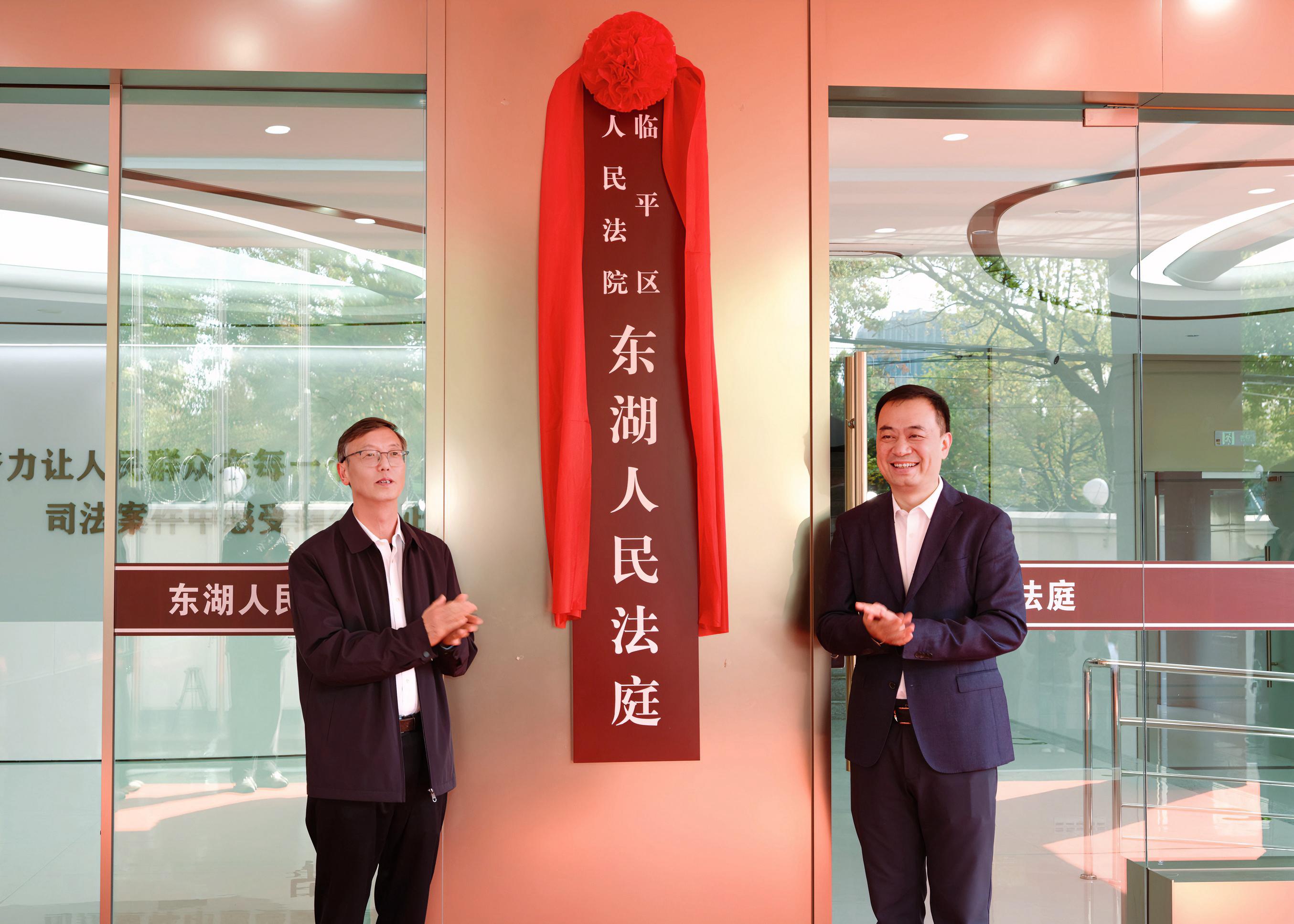 杭州中院黨組書記、院長唐學(xué)兵和臨平區(qū)委書記周徐胤共同為臨平區(qū)人民法院東湖人民法庭揭牌。
