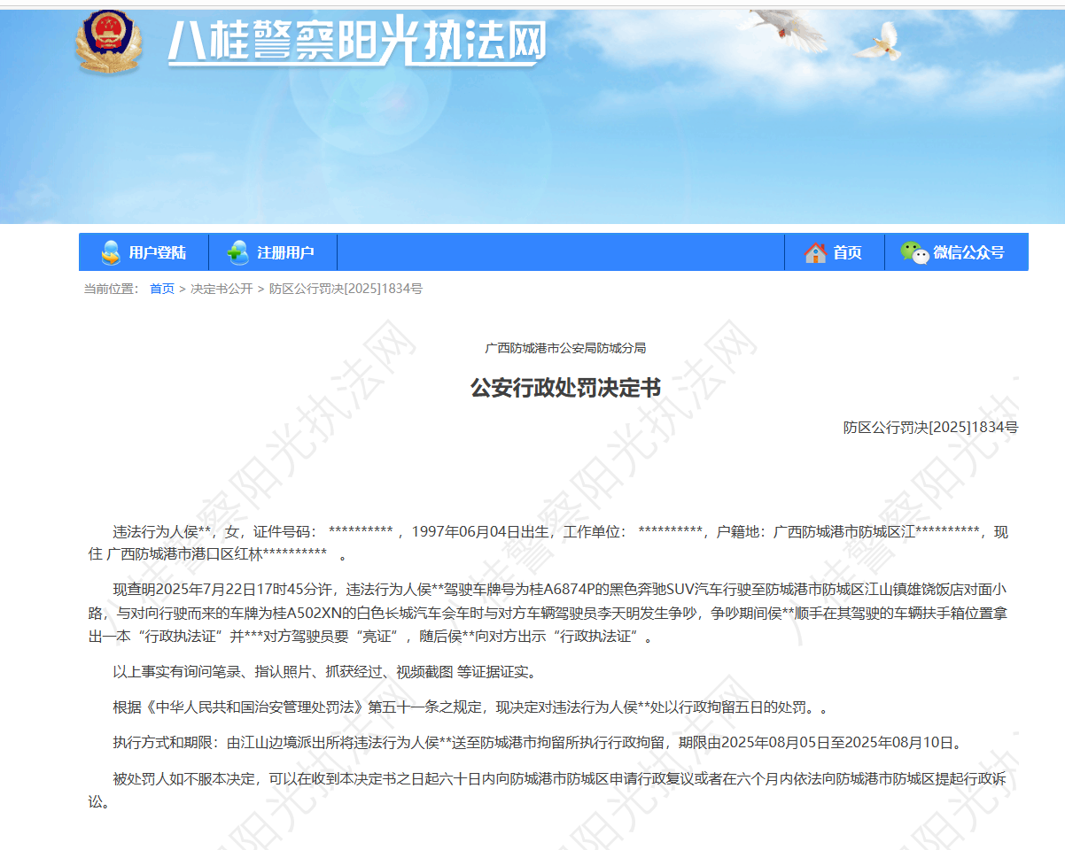 8月5日,八桂警察陽光執(zhí)法網(wǎng)公布廣西防城港市公安局防城分局公安行政處罰決定書。