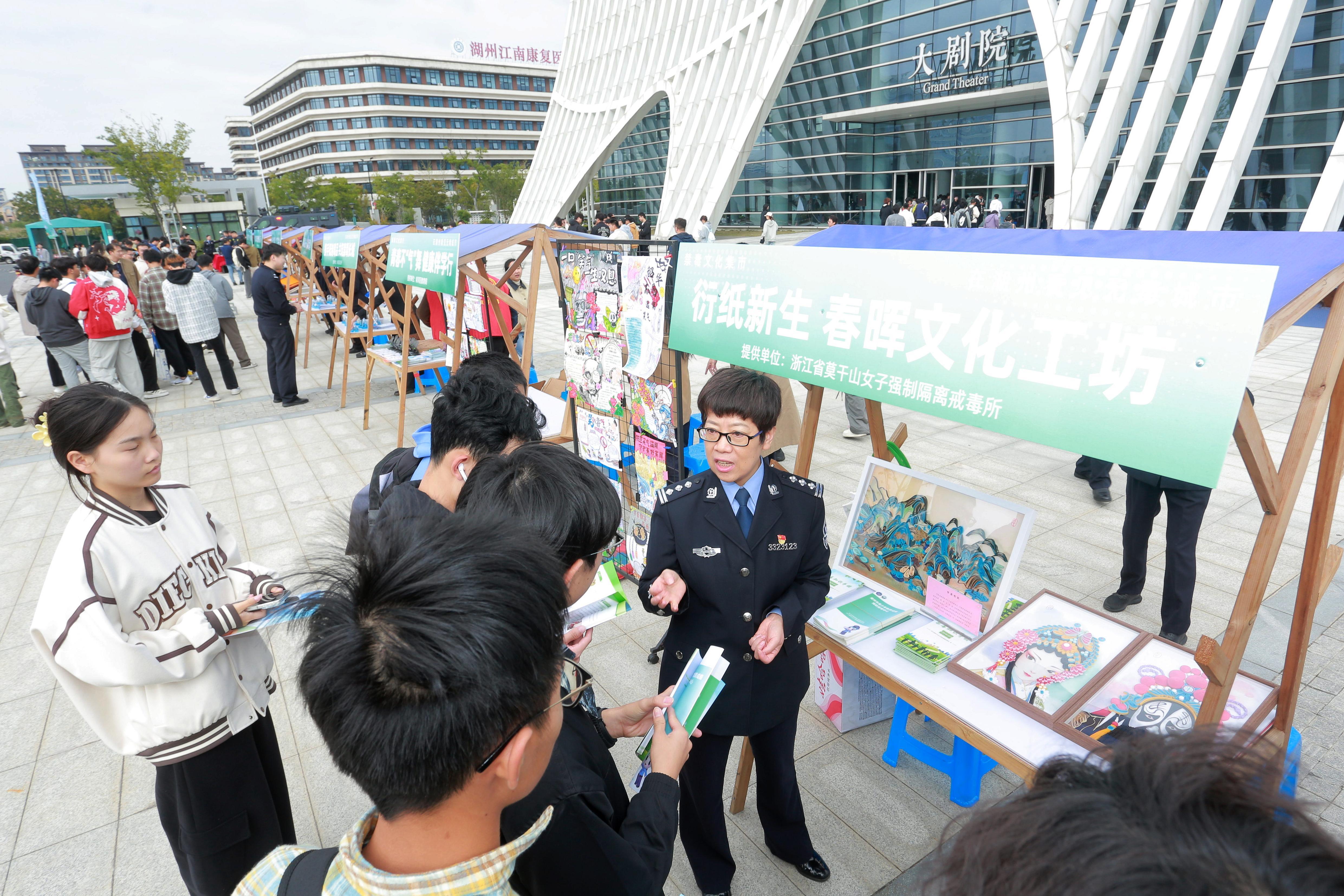 當(dāng)天,浙江水利水電學(xué)院大劇院前廣場(chǎng)的禁毒市集率先“開市”,巨型魔方禁毒logo醒目亮眼,創(chuàng)客大賽獲獎(jiǎng)作品集中展出;市公安局特警支隊(duì)的緝毒犬現(xiàn)場(chǎng)表演“識(shí)毒絕技”,靈敏嗅覺(jué)引得師生陣陣驚嘆;“機(jī)器狗尋毒”演示展現(xiàn)科技禁毒新力量,南潯公安分局特警裝備與防暴車展示更讓師生直觀感受禁毒執(zhí)法硬實(shí)力。此外,湖州市南潯區(qū)公安分局、檢察院、法院、教育局、司法局等十余個(gè)禁毒職能部門設(shè)攤宣傳,通過(guò)“笑氣”模型展示、知識(shí)折頁(yè)發(fā)放、互動(dòng)答疑等形式,將“笑氣”危害與防范知識(shí)傳遞給每一位參與者。