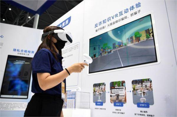 一家參展企業(yè)代表在2022年國家網(wǎng)絡安全宣傳周網(wǎng)絡安全博覽會上演示反詐知識VR互動體驗項目(2022年9月4日攝)