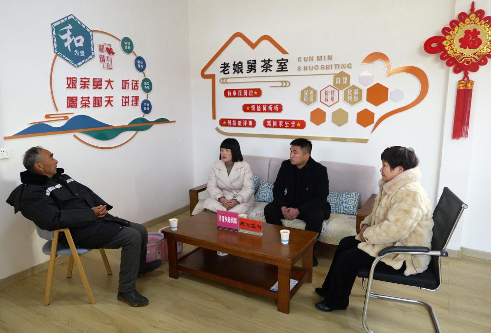 2023年12月20日,村鎮(zhèn)干部(左二、右二)和村民在河南省寶豐縣石橋鎮(zhèn)東大莊村“老娘舅茶室”交流。新華社記者 李嘉南 攝