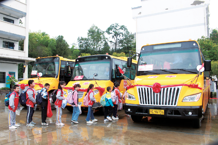 2023年9月28日,湖北省竹山縣校園直通車全域開通后,學生在有序排隊乘車。新華社發(fā)(楊娟 攝)