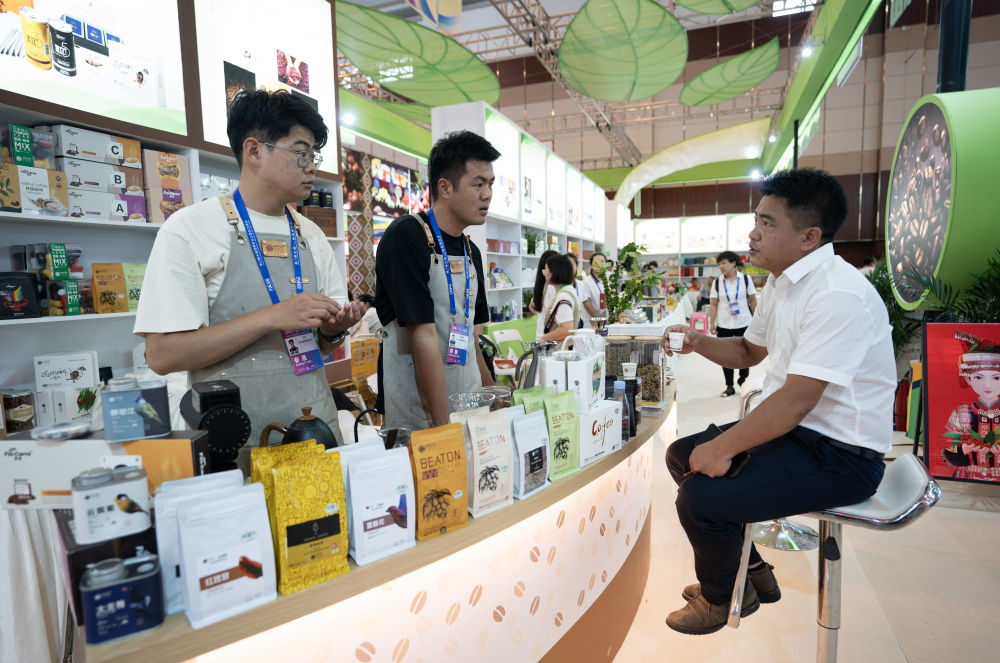 來自云南保山的參展商在第七屆中國—南亞博覽會上向參觀者介紹咖啡產(chǎn)品(2023年8月16日攝)。新華社記者 陳欣波 攝
