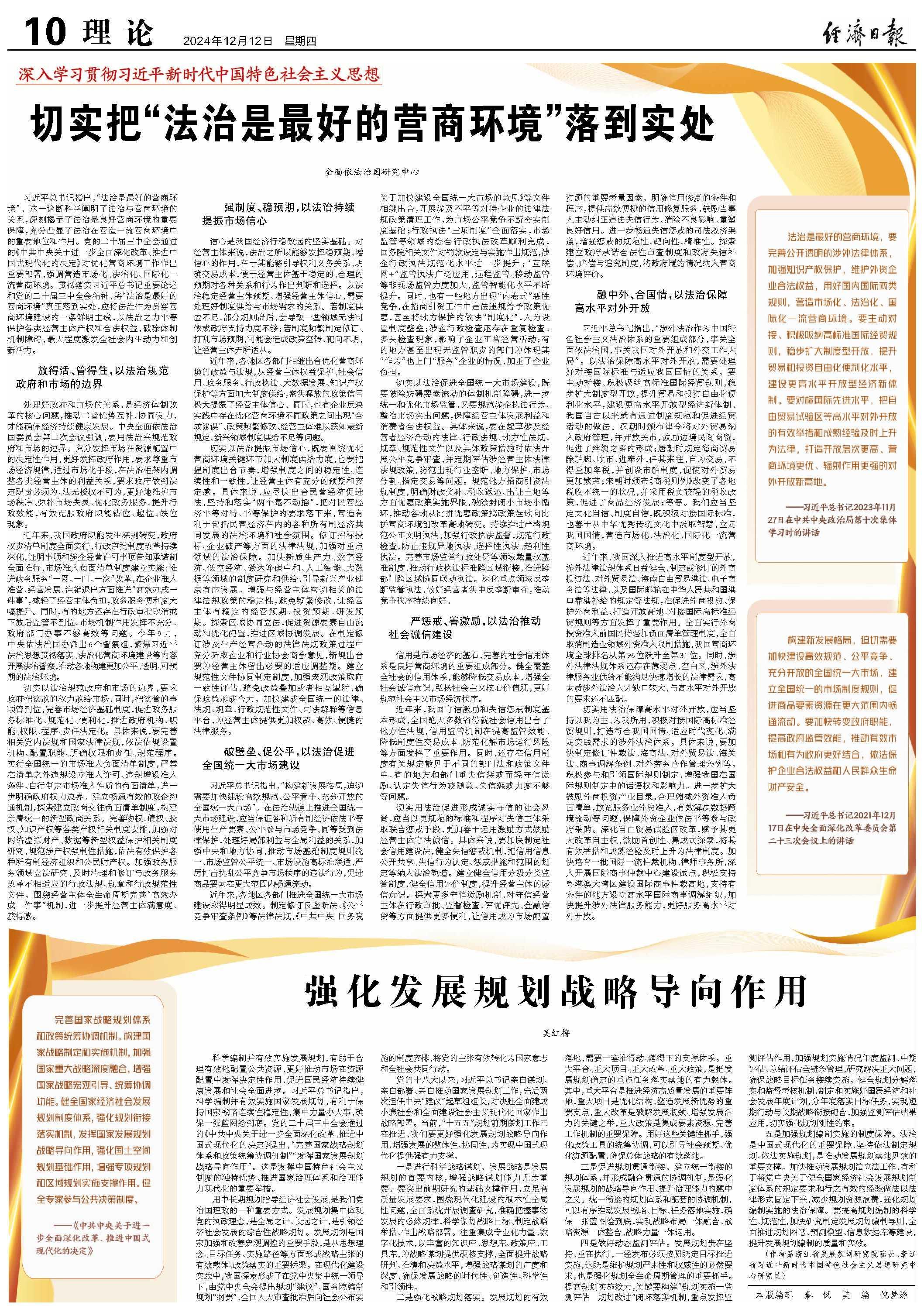 習(xí)近平總書記指出,“法治是最好的營(yíng)商環(huán)境”。這一論斷科學(xué)闡明了法治與營(yíng)商環(huán)境的關(guān)系,深刻揭示了法治是良好營(yíng)商環(huán)境的重要保障,充分凸顯了法治在營(yíng)造一流營(yíng)商環(huán)境中的重要地位和作用。黨的二十屆三中全會(huì)通過(guò)的《中共中央關(guān)于進(jìn)一步全面深化改革、推進(jìn)中國(guó)式現(xiàn)代化的決定》對(duì)優(yōu)化營(yíng)商環(huán)境工作作出重要部署,強(qiáng)調(diào)營(yíng)造市場(chǎng)化、法治化、國(guó)際化一流營(yíng)商環(huán)境。貫徹落實(shí)習(xí)近平總書記重要論述和黨的二十屆三中全會(huì)精神,將“法治是最好的營(yíng)商環(huán)境”真正落到實(shí)處,應(yīng)將法治作為貫穿營(yíng)商環(huán)境建設(shè)的一條鮮明主線,以法治之力平等保護(hù)各類經(jīng)營(yíng)主體產(chǎn)權(quán)和合法權(quán)益,破除體制機(jī)制障礙,最大程度激發(fā)全社會(huì)內(nèi)生動(dòng)力和創(chuàng)新活力。