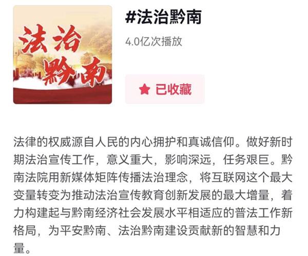 近年來(lái),黔南中院高度重視普法宣傳工作,按照“構(gòu)建大普法工作格局”“提升全民法治素養(yǎng)”“推進(jìn)法治文化建設(shè)”思路定位,采取“指尖+腳尖”的方式,通過(guò)打造“法治黔南”網(wǎng)絡(luò)普法品牌,以品牌統(tǒng)領(lǐng)網(wǎng)絡(luò)普法陣地建設(shè)、活動(dòng)開(kāi)展、作品創(chuàng)作,不斷擴(kuò)大網(wǎng)絡(luò)普法的傳播力與影響力。