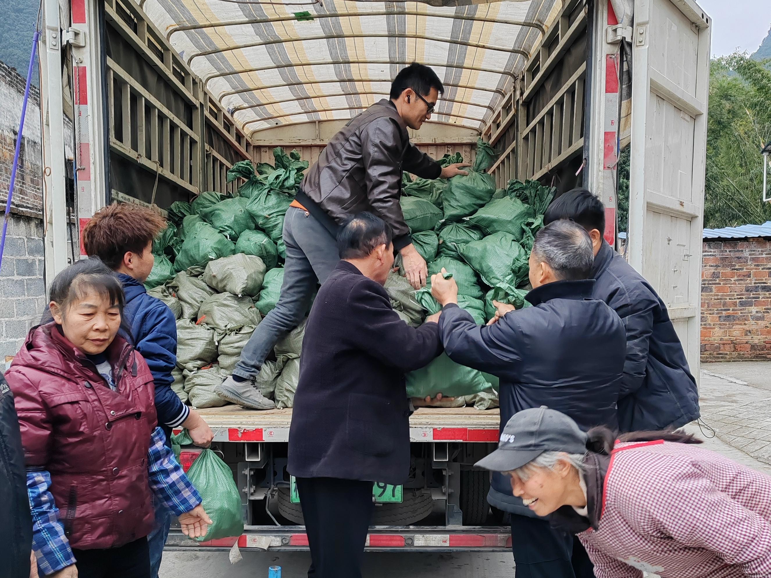 圖為廣西壯族自治區(qū)監(jiān)獄管理局派駐龍騰村第一書記韋國黨(右二)幫助村民將銷售的紅薯裝上貨車。韋昱洲 攝
