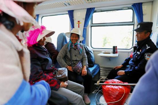 圖為乘警李學忠(右)和乘車的村民聊天。 唐明龍 攝