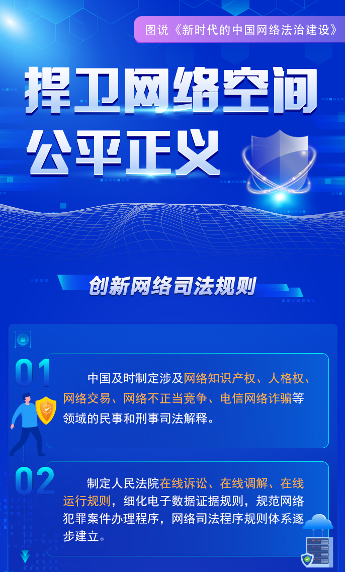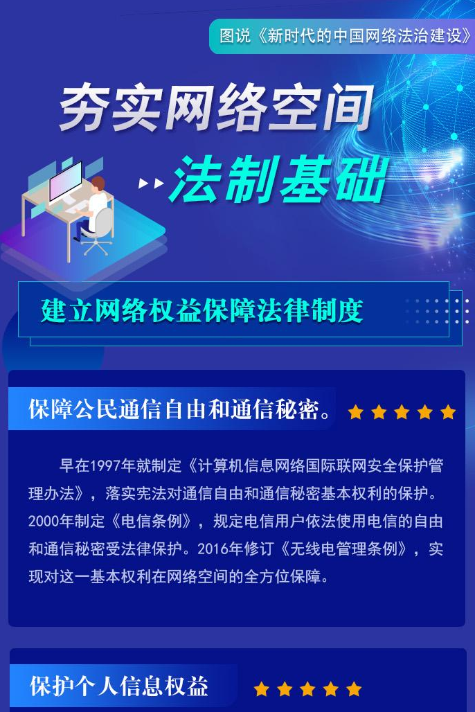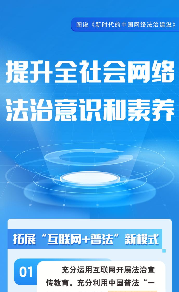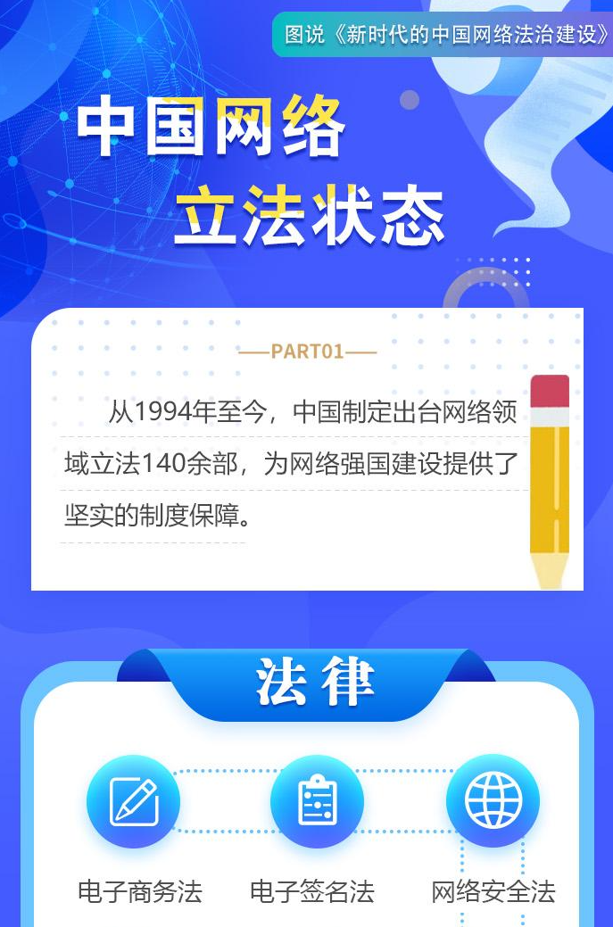 自1994年全功能接入國際互聯(lián)網(wǎng)以來,中國堅持依法治網(wǎng),持續(xù)推進(jìn)網(wǎng)絡(luò)空間法治化,推動互聯(lián)網(wǎng)在法治軌道上健康運(yùn)行。進(jìn)入新時代,在習(xí)近平新時代中國特色社會主義思想指引下,中國將依法治網(wǎng)作為全面依法治國和網(wǎng)絡(luò)強(qiáng)國建設(shè)重要內(nèi)容,努力構(gòu)建完備的網(wǎng)絡(luò)法律規(guī)范體系、高效的網(wǎng)絡(luò)法治實施體系、嚴(yán)密的網(wǎng)絡(luò)法治監(jiān)督體系、有力的網(wǎng)絡(luò)法治保障體系,網(wǎng)絡(luò)法治建設(shè)取得歷史性成就。