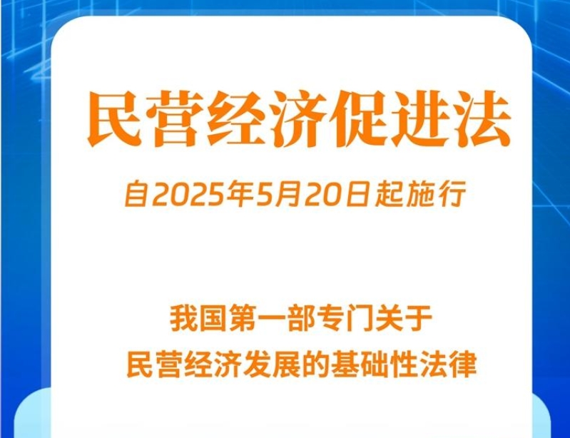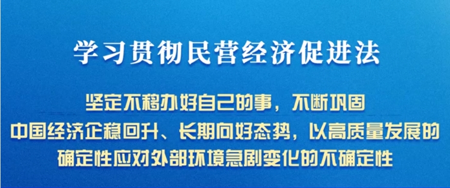 民營(yíng)經(jīng)濟(jì)促進(jìn)法將于今年5月20日起施行。作為我國(guó)第一部專門關(guān)于民營(yíng)經(jīng)濟(jì)發(fā)展的基礎(chǔ)性法律,民營(yíng)經(jīng)濟(jì)促進(jìn)法的制定出臺(tái)是貫徹落實(shí)黨的二十屆三中全會(huì)決定和習(xí)近平總書記在2月17日民營(yíng)企業(yè)座談會(huì)上重要講話精神的重大舉措,是貫徹習(xí)近平法治思想、習(xí)近平經(jīng)濟(jì)思想的生動(dòng)實(shí)踐……...[詳情]