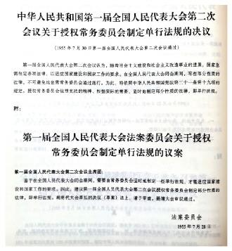 1955年7月30日,根據(jù)法案委員會(huì)的建議,一屆全國人大二次會(huì)議作出決定:“隨著社會(huì)主義建設(shè)和社會(huì)主義改造事業(yè)的進(jìn)展,國家急需制定各項(xiàng)法律,以適應(yīng)國家建設(shè)和國家工作的要求。在全國人民代表大會(huì)閉會(huì)期間,有些部分性質(zhì)的法律,不可避免地急需常務(wù)委員會(huì)通過施行。為此,特依照中華人民共和國憲法第三十一條第十九項(xiàng)的規(guī)定,授權(quán)常務(wù)委員會(huì)依照憲法的精神、根據(jù)實(shí)際的需要,適時(shí)地制定部分性質(zhì)的法律,即單行法規(guī)?!痹摏Q定改變了全國人大是行使國家立法權(quán)唯一機(jī)關(guān)的規(guī)定,是對(duì)1954年憲法的重要補(bǔ)充和發(fā)展。