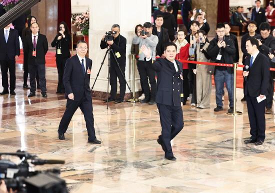 圖① 3月9日,十四屆全國人大四次會議第二場“代表通道”集中采訪活動在北京人民大會堂舉行,代表一邊走向通道一邊向記者揮手。