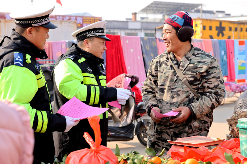 春節(jié)臨近,山東省棗莊市公安局市中分局交通警察大隊開展“鄉(xiāng)村‘年集’講安全”活動,組織民警深入鄉(xiāng)村“年集”宣傳交通安全知識。圖為民警向駕駛機(jī)動三輪車的攤主宣傳安全行駛知識。