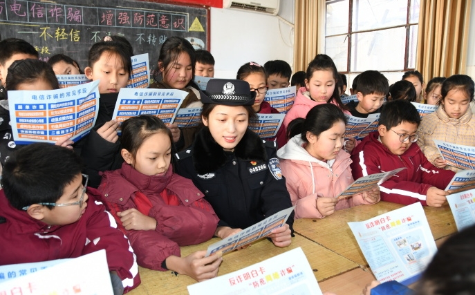 近日,河南省??h公安局衛(wèi)溪派出所組織民警走進(jìn)中小學(xué)校開設(shè)“平安課堂”,向?qū)W生宣傳講解安全防范知識(shí)。圖為民警向?qū)W生發(fā)放《反詐明白卡》,并講解反詐防詐知識(shí)。